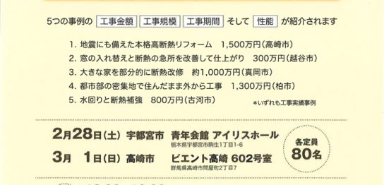 宇都宮(2/28)と高崎(3/1)で、断熱耐震リフォームフェアが開催されました。…