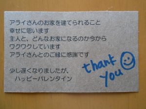 お施主様からバレンタインのクッキーとメッセージを頂きました。 奥様と御主人のこれ…