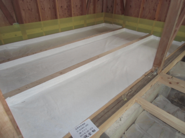 写真は床断熱の気流止めの方法の一つ 住宅外部設置の黄色いポリエチレンフィルムの施工ポイントです。