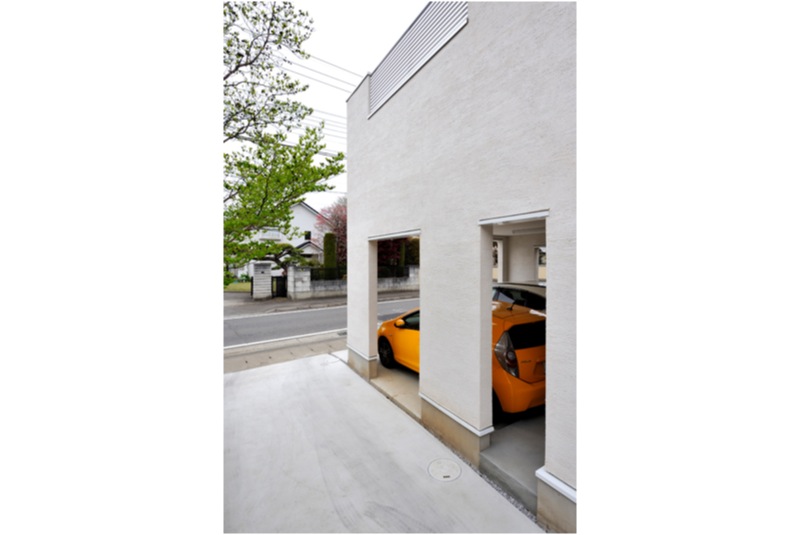 前橋南町に完成した低炭素認定住宅 1階がビルトインの駐車場で、2階にリビングがあり、白基調のちょっとオシャレな住宅です。