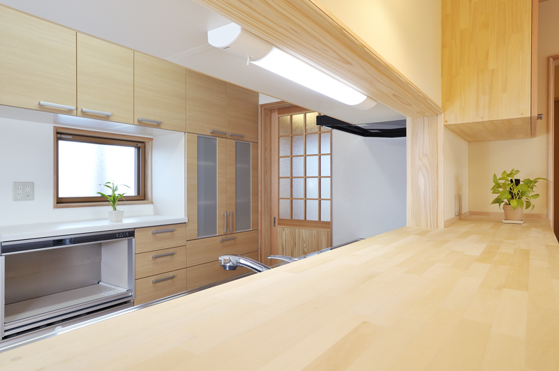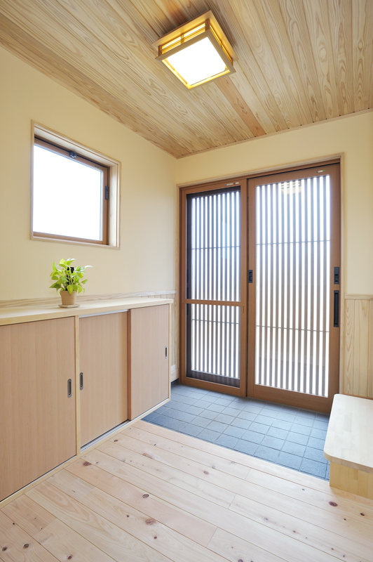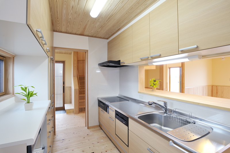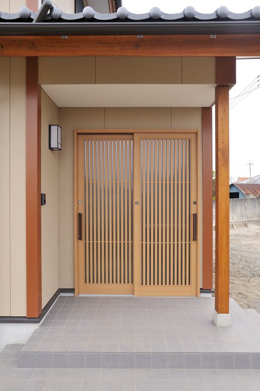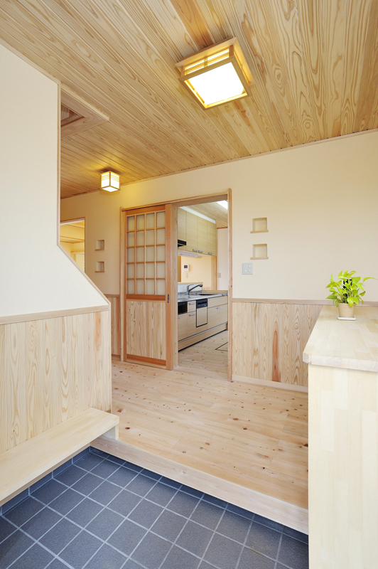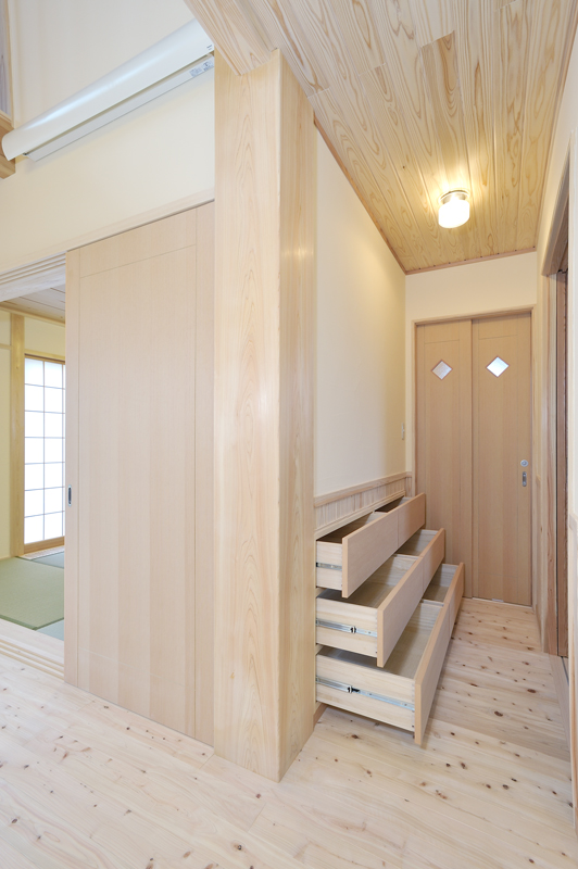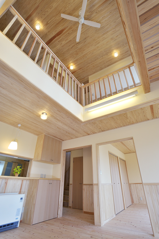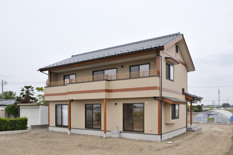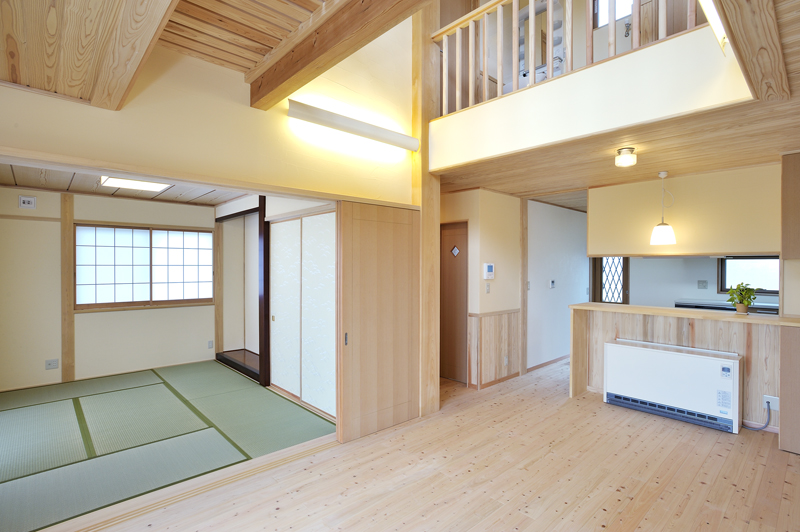 宅地は前橋の南、元旦の「駅伝」で第2中継所の、登利平の北側、周囲が田んぼでのどかな場所にある。住宅は木造2階建て瓦葺屋根で、落ち着いた色合いの住宅である。住宅内に入ると、檜の良き香りと、無節の杉板と、珪藻土の調和がとれ、何処となく落ち着きを感じる。玄関正面の手作りの引き戸を開けるとキッチンがあり、使いやすさを映している。リビングに入ると檜の9寸角の大黒が存在感を表している。吹き抜けは開放感と明るさを感じる。建具は引き戸が殆どで、特に1階に関して1本引きや2本引きを駆使していて、広い開口を提供している。洗面所やトイレ入り口は850以上の有功幅があり、高齢者対策は十分施されている。和室は客間の様であるが、北側の押入れに引出しをローカ使用で内装している。主寝室居入口は2枚引きの建具が上手に細工され1100ミリの広い開口が実現した。杉板が縦に貼られている階段室を通って2階に上がると、吹きぬけの周りにキャットウォークがある。南側の広いサッシは太陽の光を十分取り入れ、昼寝の心地良さが想像される。居室は2室でそれぞれロフトがあり、屋根断熱ならではの大きな空間が提供されている。何処となく長いしたい住宅です。
