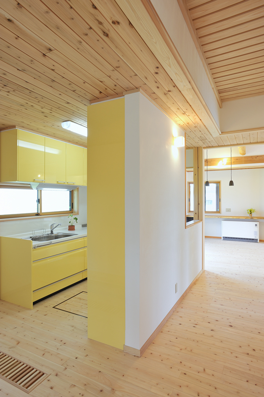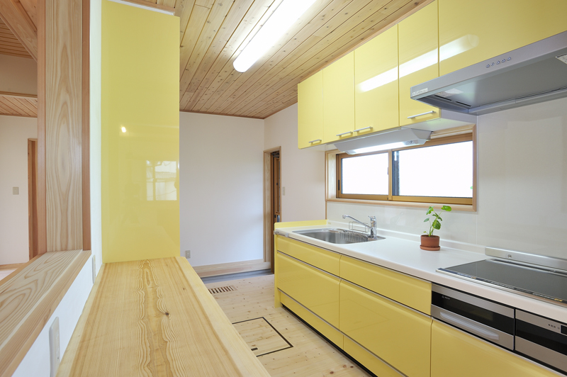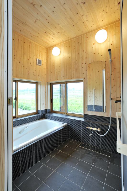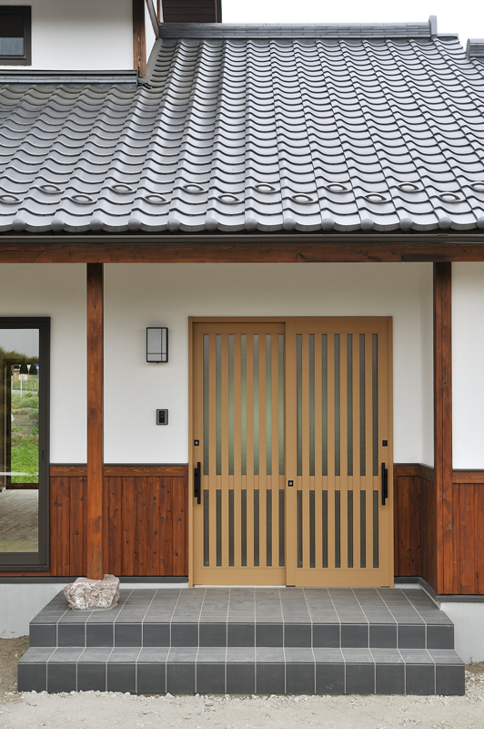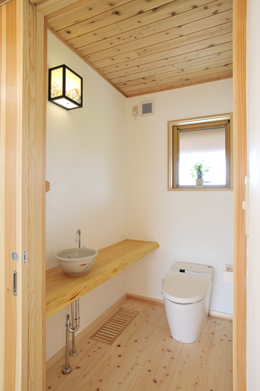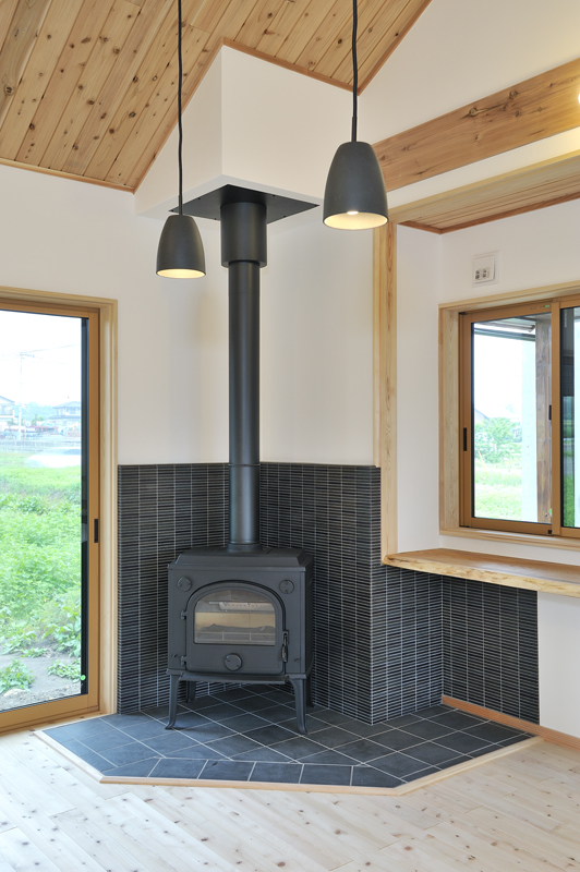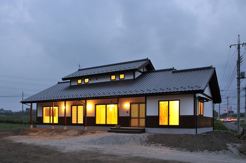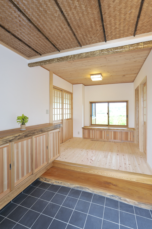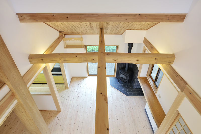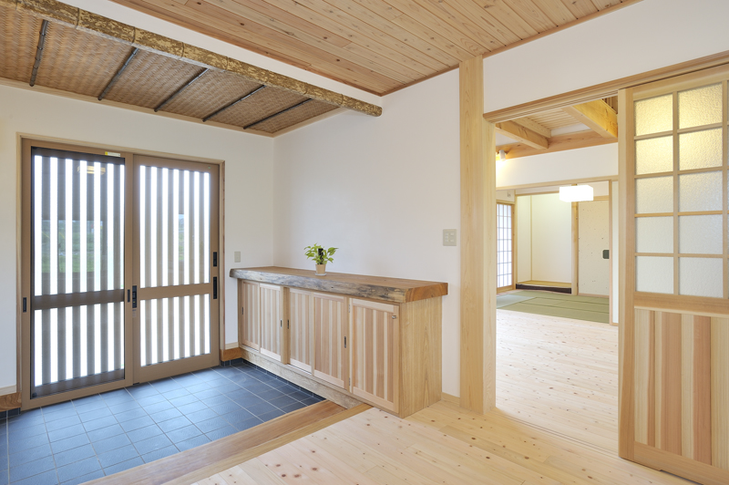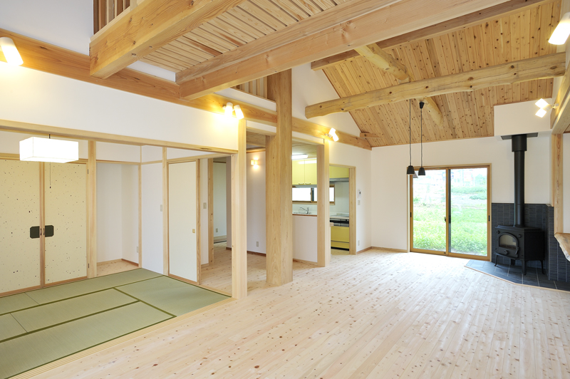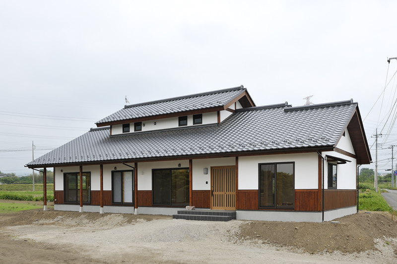 今回完成いたしました住宅は、木材の大好きなお施主さまで、いたるところに立派な材木が使用されました。外見は漆喰と腰板、屋根は瓦でどことなくレトロな雰囲気がいたします。玄関の中には、ゆとりを感じる空間があり、欅の式台と天板、角竹とすす竹で縁取られた天井が、豪華さを一段と強く感じさせます。居間には、欅の大黒柱が屋根を支える木材を軽々と受け、300ミリの大きさは周囲にある檜の180ミリ角の柱も小さく感じさせます。暖炉にともる火は、家族の団欒に大きな役割を果たすでしょう。和室の天井は杉の板を匠の技で仕上げてあり、とても新鮮に感じられます。浴室は手作りで檜の壁、天井とタイル下の床暖房は、入浴者の疲れを取ってくれることでしょう。東西にある寝室は、空気の流れの考慮がされ、それぞれの階段は2階をひと回りでき、階段材の木曽ヒノキはよき香りを漂わせています。越し屋根は、夏の換気通風にどれだけの効果を出してくれるか 今から楽しみです。