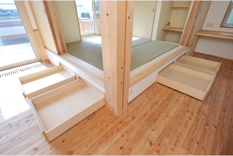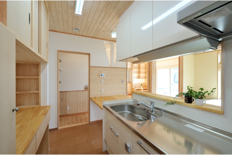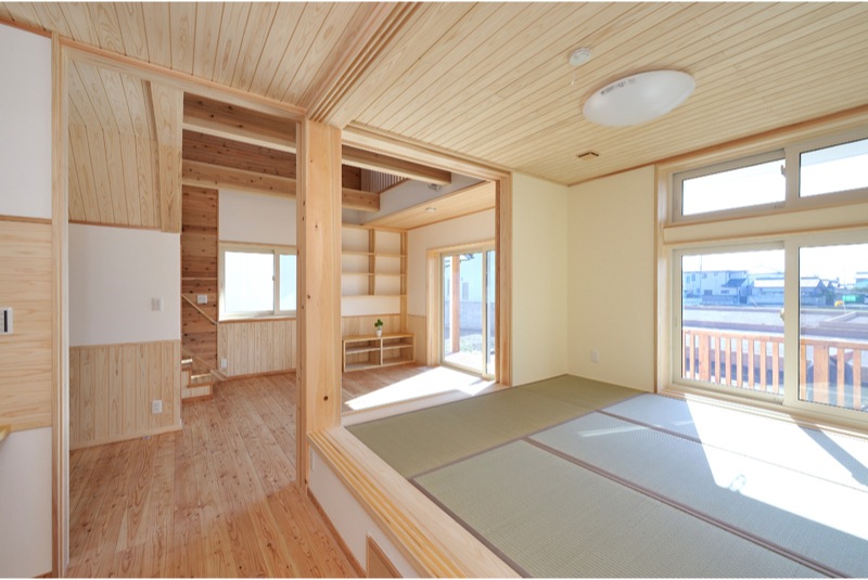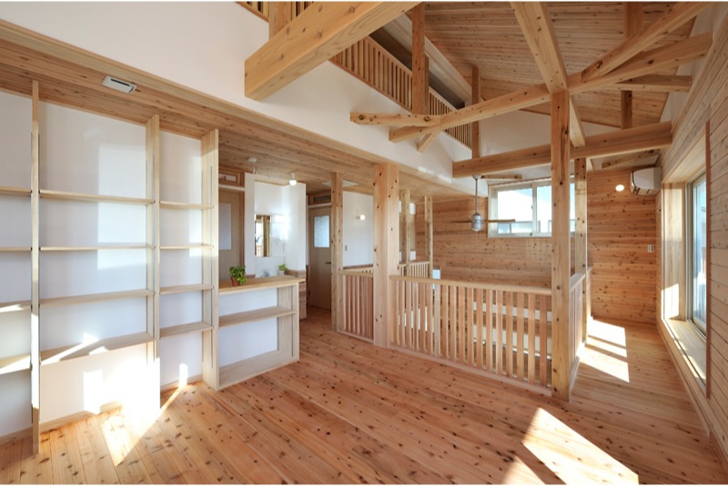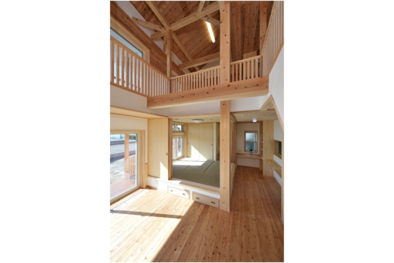 前橋工科大学の南の閑静な住宅分譲地に今回完成した住宅はあります。木造2階建てガルバニウム鋼鈑葺、延べ床面積113.83m2(34.43坪)の広さです。白いイメージの外部はサイディング貼りでチョットお洒落な住宅です。ウッドデッキやバルコニーは屋根がかぶり劣化対策もできています。玄関より住宅内に入ると檜の床板や腰板、漆喰壁に杉の天井で、その他の居室の床板は唐松、腰板は杉、天井板は杉で漆喰壁と自然素材豊かな住宅に仕上がりました。リビングにある檜の240ミリの大黒柱や杉の梁、が見える吹き抜けの天井には雄大さを感じます。サッシはPVCアルゴンガス入りLowEペア、断熱仕様は基礎40K、GW150ミリ 壁16K、HGW220ミリ 屋根16K、HGW360ミリで換気扇に熱交換型を使用しました。昨年よりはじまりましたゼロエネルギー住宅の仕様で太陽光発電、LED電球、高効率な冷暖房システムなど多彩な設備も使用いたしました。