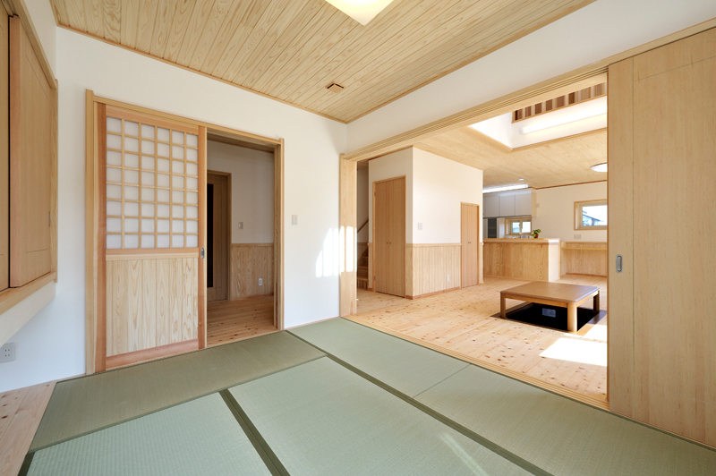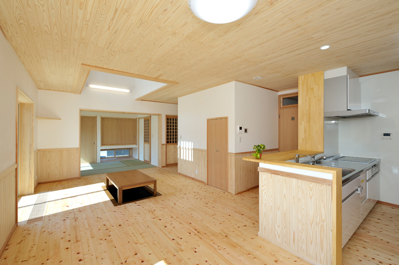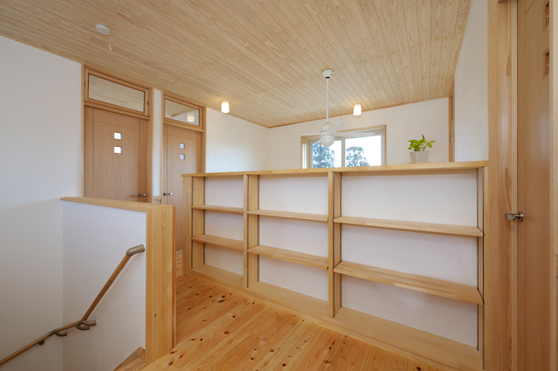 完成した物件は福島橋のたもとで玉村側に位置します。住宅の規模は木造2階建てガルバニウム鋼板葺、延べ床面積135.01m2です。お客様との出会いは完成内覧会でした。弊社にもお見えいただき2人の元気なお子様とお話を良く聞いて戴けるご夫妻がとても好印象でした。外部は綺麗に貼り分けられたサイディング、内部は檜の床板 杉の天井板と漆喰壁、自然素材満喫で、大変落ち着けるし、心を癒せる住宅に仕上がりました。ゼロエネルギー住宅は創エネ設備が必要で使用するエネルギー量を最低でも生み出すだけの設備量になります。オール電化で高効率のエアコンでの暖房、LED照明、直流モーターの熱交交換型扇は、箱物のこれでもかという性能UPでさらに威力を発揮して、弊社の唱える理想的なゼロエネルギー住宅が完成しました。