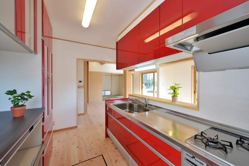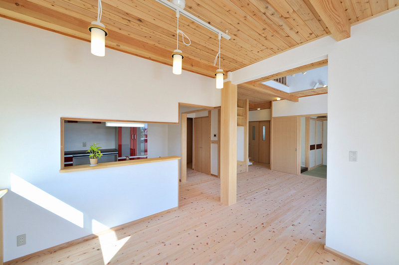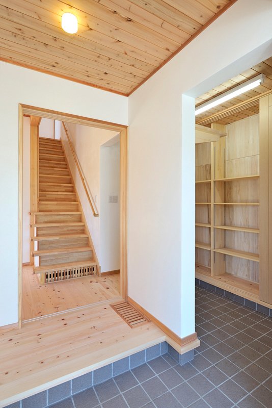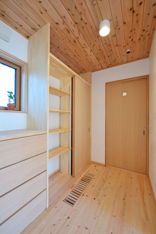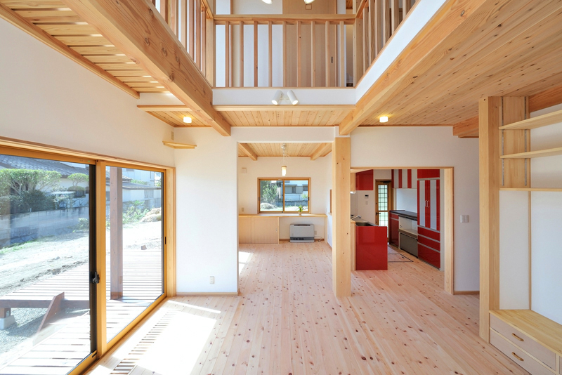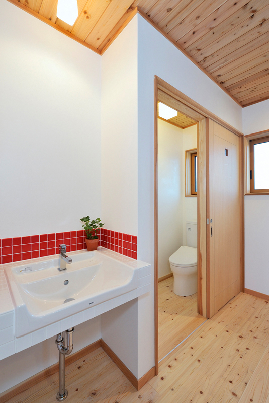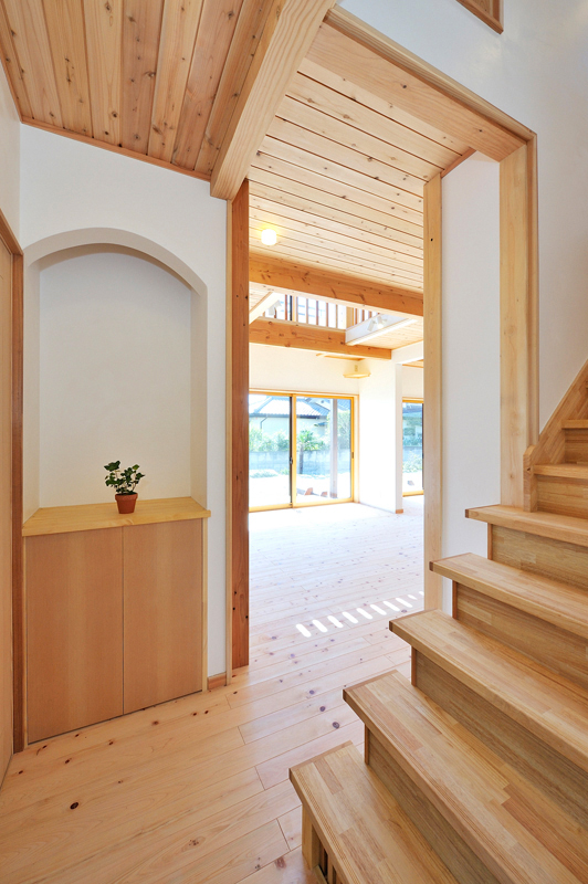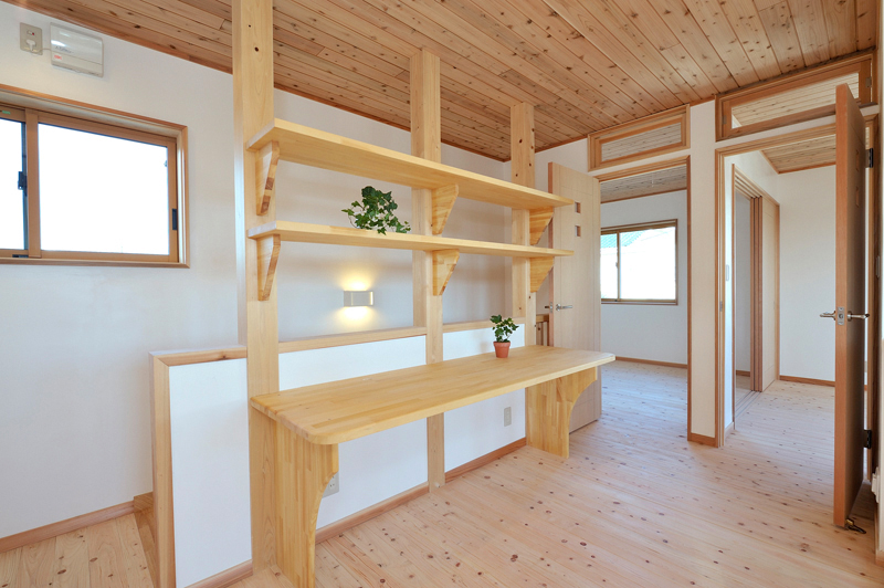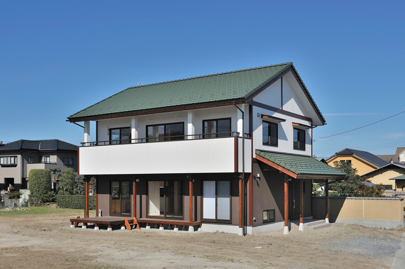 完成した住宅は何処となくゆとりがある家です。倉賀野町の住宅団地内に完成した住宅は日当たりの良く、幹線道路からは200メートル程団地内に入った閑静な場所です。外見は1階部分に木目調のサイディング2階部分に漆喰調のサイディングで鮮やかなグリーンの瓦がとても印象的です。住宅内は玄関を開けると檜の香りが気持ちを癒します。玄関奥のシューズクロークは、広く大きな収納スペースがあります。大きな窓でとても明るいリビングは、大きな吹き抜けと高い天井と杉板や漆喰などの自然素材から心地よさとゆとりを感じます。リビングの北側には、洗面所との間に引き出しや収納があり、プライベートと利便性を考慮した設計の質の高さを感じます。トイレの中には信楽焼のボールが、品の良い顔を出しています。2階のホールに大きなテーブルがあり、楽しそうにパソコンを動かしているすがたが想像されます。住宅内は自然素材が一杯で良い香りや良き空気が疲れた体を癒してくれる事でしょう。