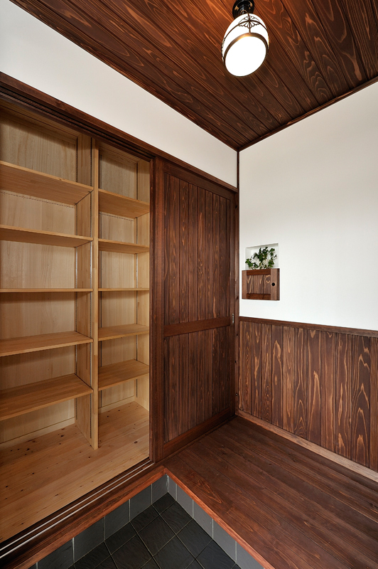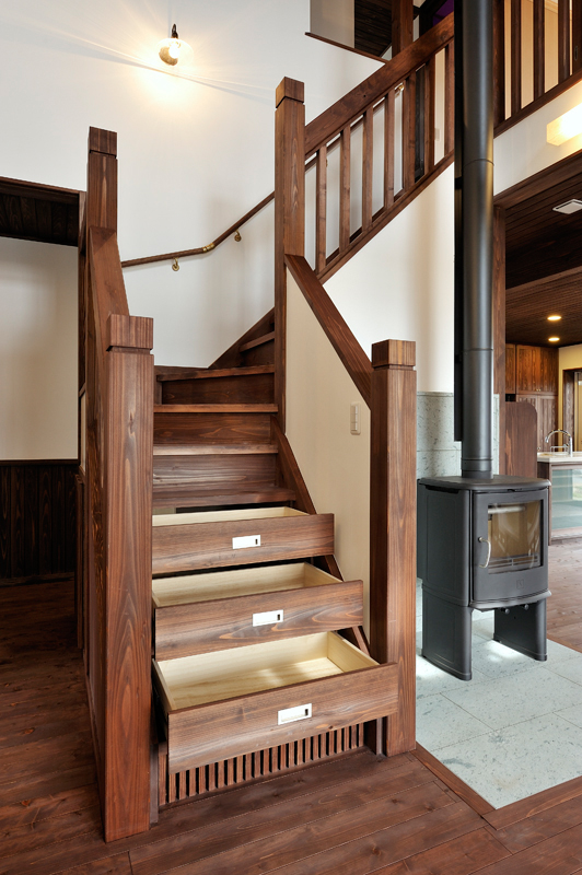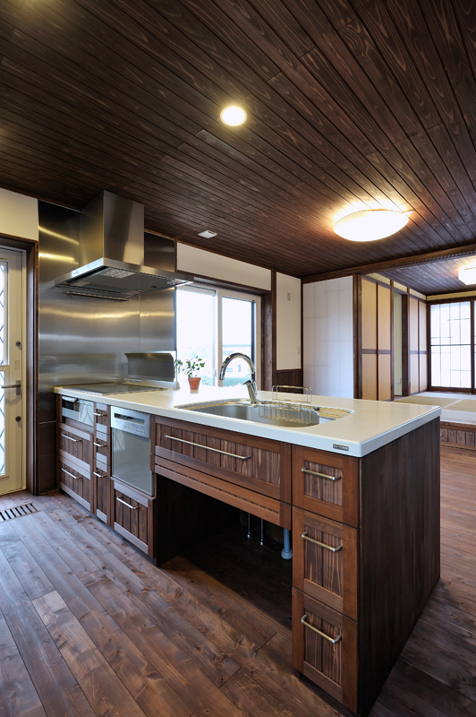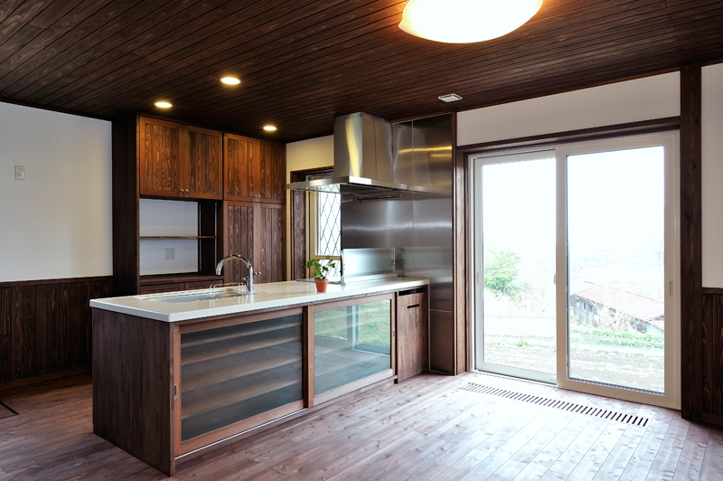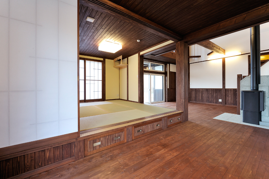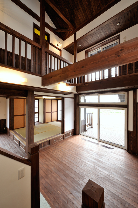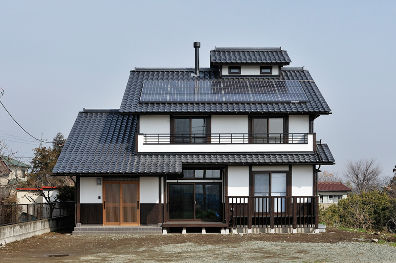 木造2階建て瓦葺の住宅で、断熱材が通常の住宅に比べて倍の厚みを施してあり、夏対策の越し屋根もしっかり施工し、夏 冬の対策が整いました。長期優良住宅で品格法の建設評価を取り、県産材と太陽光発電の補助金を申請しています。外部は古民家調に仕上がり、内部は檜の床板・漆喰壁・杉の天井板と、自然素材がいっぱいで自然塗料で色を付けています。