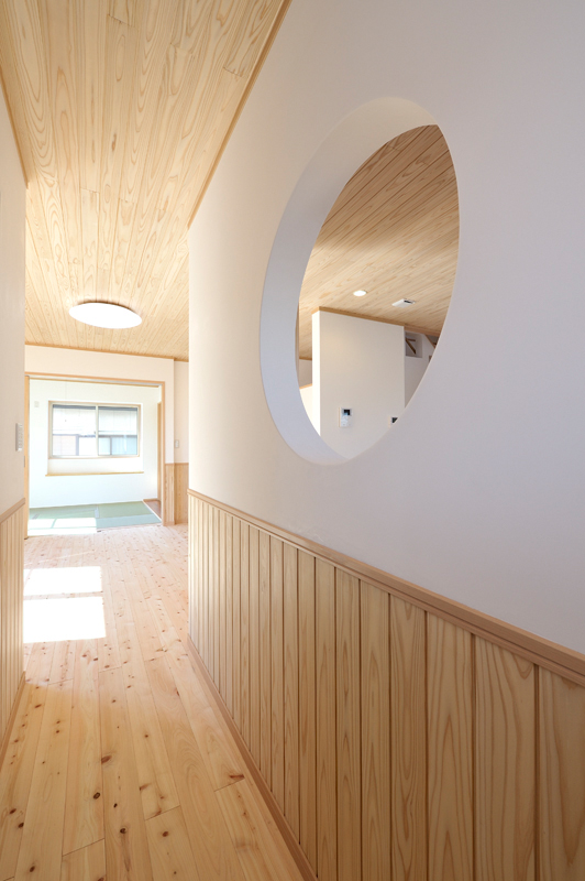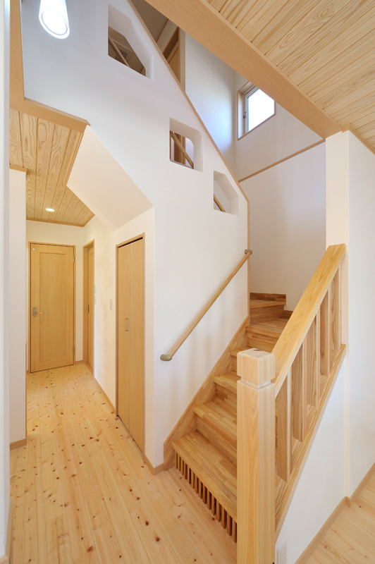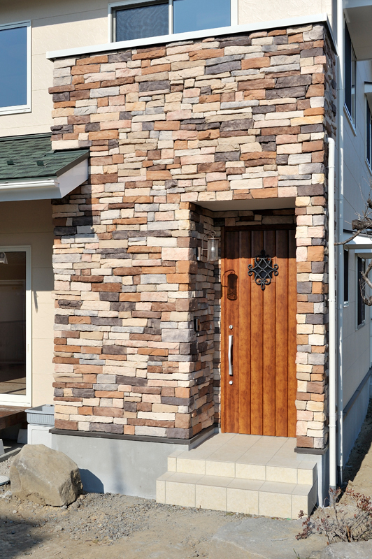 場所は高崎市の石原町、住宅の規模は木造階建て、延べ床面積132.9m2、グラスファイバーシング葺です。洋風の外観は玄関周りにレンガを貼り落ち着いた感じを演出しており、住宅内部は桧の床と杉の天井、漆喰壁と自然素材が沢山された、長期優良住宅です。空気の流れや明るさにも注意が払われた住宅でもあります。
