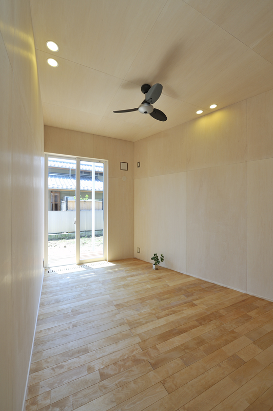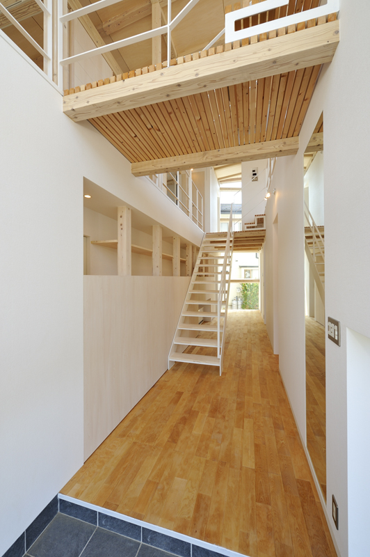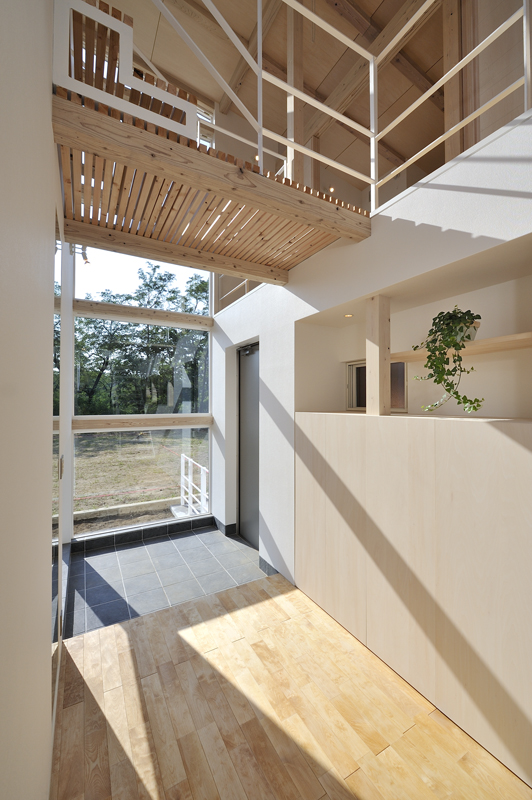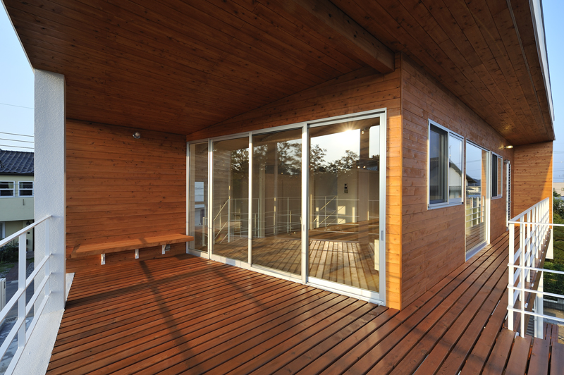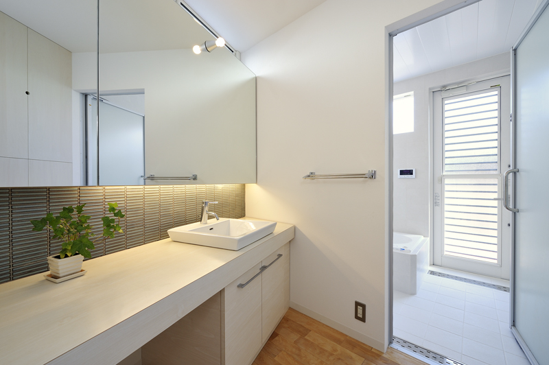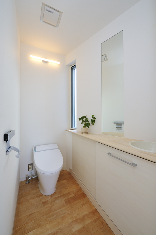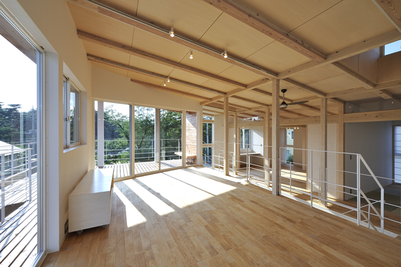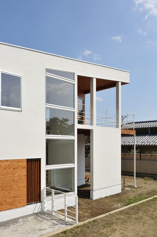 前橋市の敷島公園のバラ園の東側に今回の住宅は完成いたしました。住宅は木造2階建てのキューブ型で、大きなサッシが目を引く都会的センスたっぷりのデザインです。駐車場がビルトインされた住宅の玄関のドアを開け中に入ると今度は白を基調に考えられた、壁、天井に洗練されたセンスを感じます。1階にはトイレ、浴室とプライベートルームがあり、鉄骨の階段を上がって2階行くと360度大パノラマとに間違える開放感のあるリビング、天井には群馬県産材の杉の梁が頑張って存在感を出しています。断熱は基礎、壁、屋根にGWをそれぞれに施してサッシはアルミPVC複合サッシにLowEペアガラスがはいっています。電気のついた夜の写真は、こんな住宅に住めたらどんなに幸せな事だろうと思うほど見事でした。