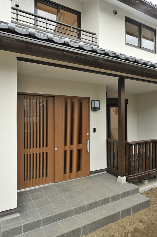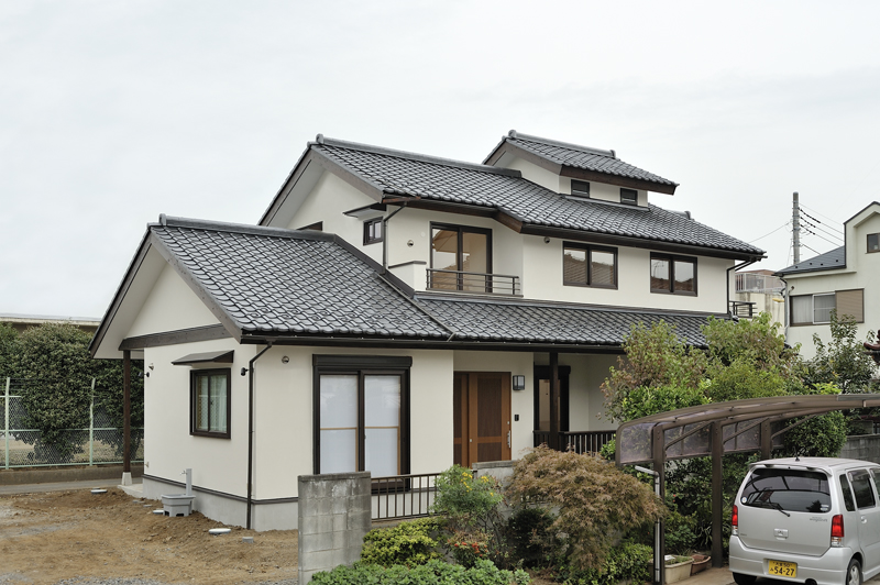 夏対策用の腰屋根付き 瓦葺 約45坪の2階建て