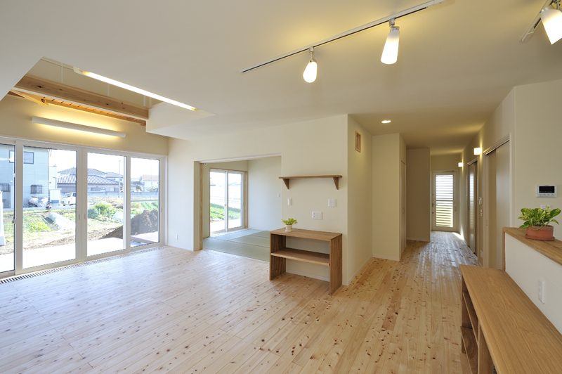 住宅の基本は、お客様が健康に案心して安全に暮らせる場所の提供です。基礎を始めとする構造がしっかりして、最大のバリアーである温度差が解消されて、自然素材とともに癒される空間のご提供とも言い替えられます。みどり市笠懸に完成した住宅は、今までの(株)アライのイメージを一新する住宅ですが、住宅の基本にはのっとっています。外観も内観も白が基調になり、珪藻土壁・珪藻土天井・サッシの形状・吹き抜けの鉄骨のテスリなど、今までのイメージとは明らかに異なる、すっきりしていて繊細な住宅に仕上がりました。中はとても暖かく、癒される空間になり、テラスでのバーベキューは今から楽しみです。