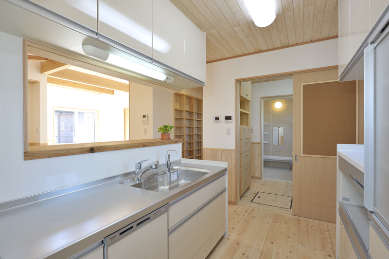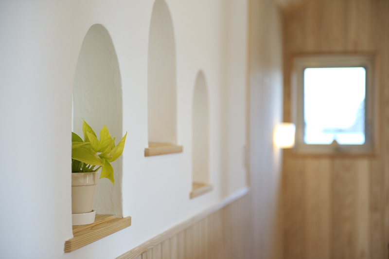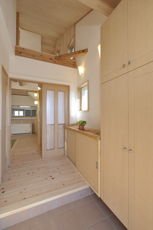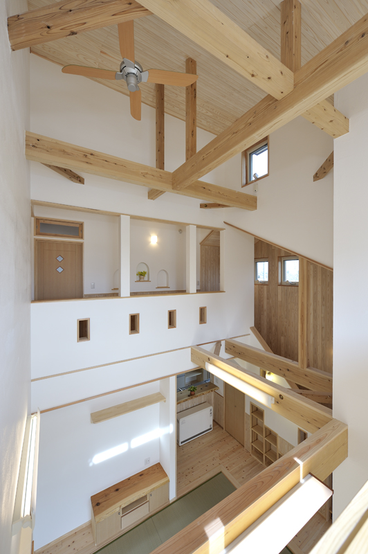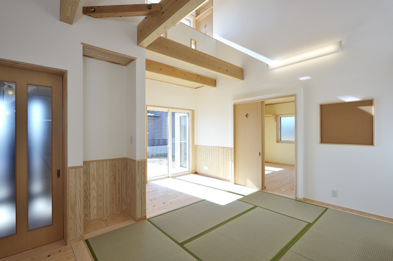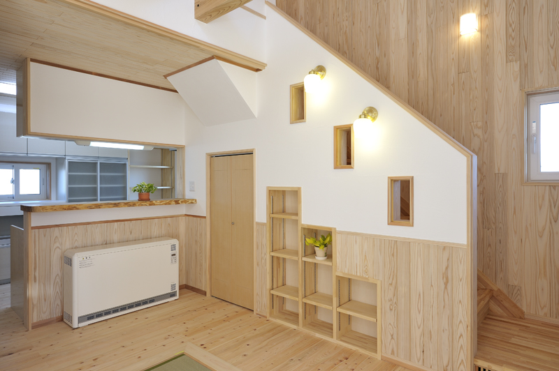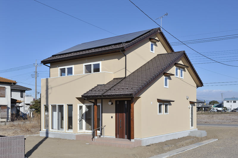 木造在来工法2階建て瓦葺住宅は、外壁にモルタルを塗り塗装を掛けてあります。玄関を開けて住宅内に入ると自然素材が沢山使用してあり、木材の心地よい香りと、漆喰の白さが際立ちます。階段室の板張りはとても癒される空間に仕上がり、居間の大きな吹き抜けも壮大なイメージを与えてくれます。工事着工前におこなった埋炭は、体中から力を抜きリフレッシュさせてくれそうです。断熱、気密工事はいつものことながらしっかり行い ヒートショックから体を守ってくれることでしょう。