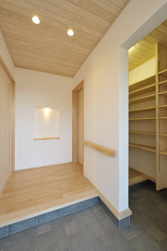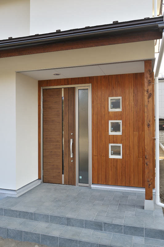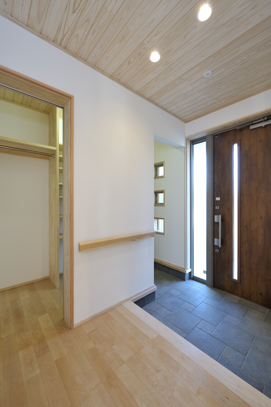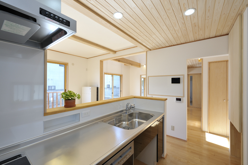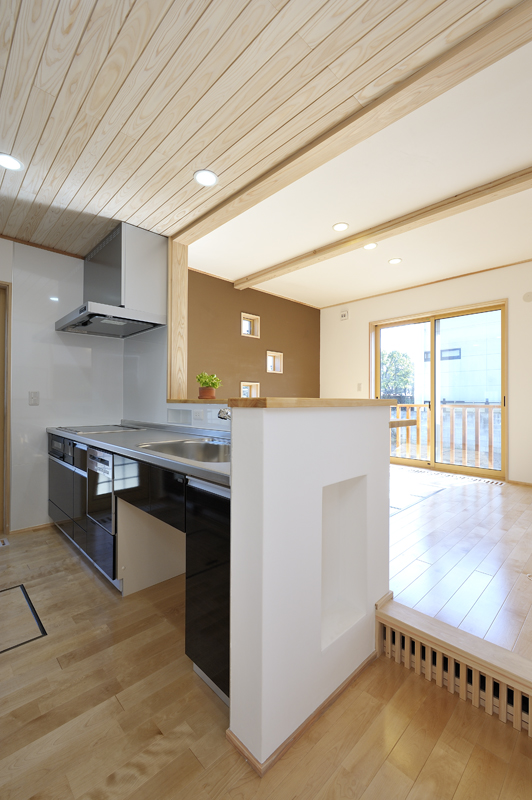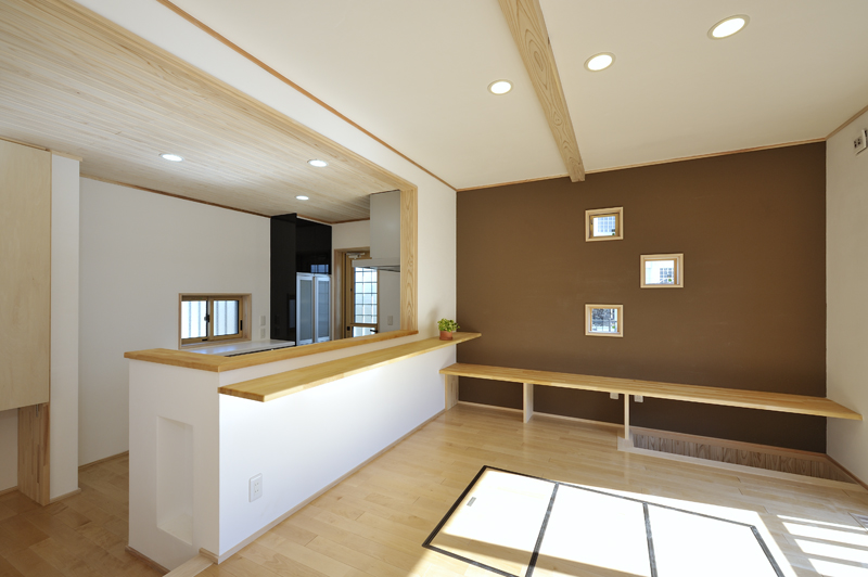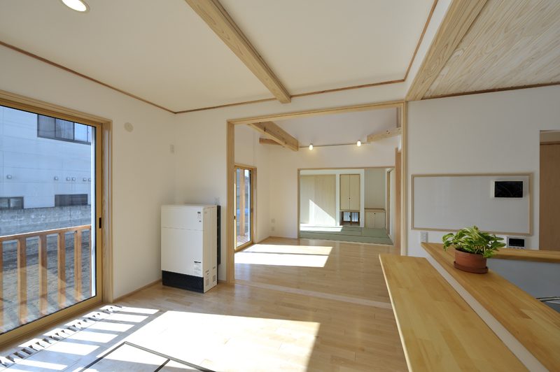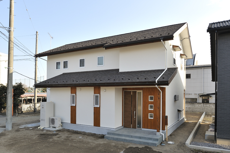 高崎市立経済付属高等学校の入口の分譲地、屋根にグラスファイバーシングルを葺き、少し垢抜けた建物です。2階建て。1階に入ると玄関の脇にあるシューズクローク。桜の床板を踏みしめてリビング、大きな吹き抜けと漆喰とで、大変気持ちが安らぎます。和室の扉は3枚引き。アルミの引手はとても軽さがアピールされています。ダイニングスペースは一段高く、日当たり良く暖かそうな空間です。2階の子供室、リビングのTV台と大変いつもと少し違った、とても細やかな細工がなされ、屋根の上の太陽光発電の成績が大変楽しみな住宅です。