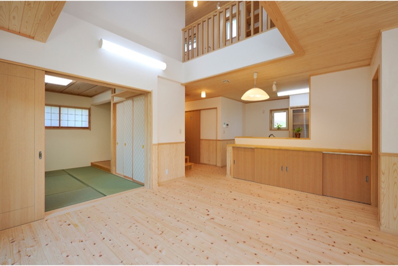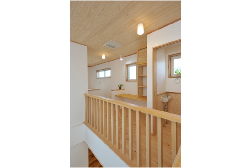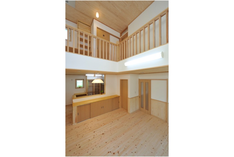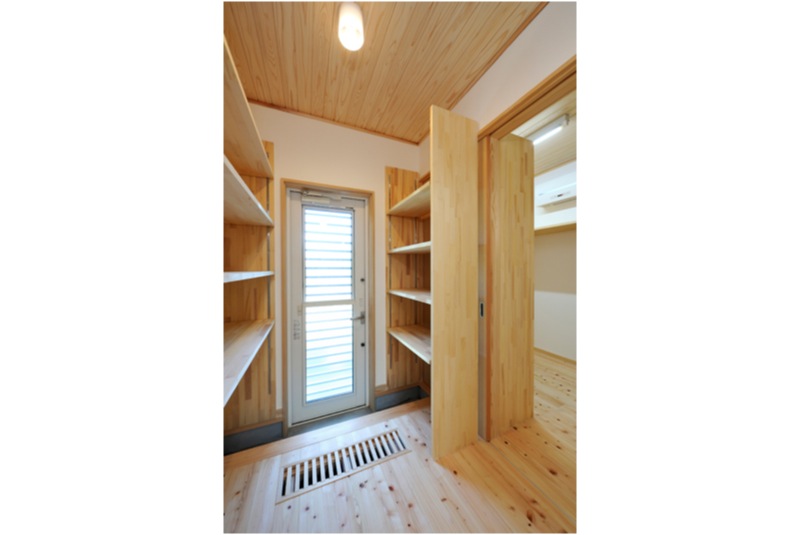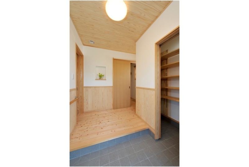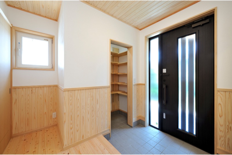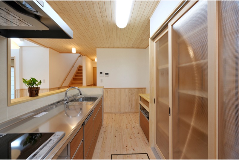 断熱材は、床断熱グラスウール40K100㎜、壁 高性能グラスウール16K120mm、天井 吹込み用グラスウール300mmで、サッシはPVCアルゴンガス入りLOWEになっています。内部は檜の床と杉の天井板、漆喰壁と自然素材が沢山使われた住宅に仕上がりました。住宅内では玄関からの動線が面白く組まれ、キッチン周りの収納が上手に組み立てられており、お施主様の思い入れを感じました。