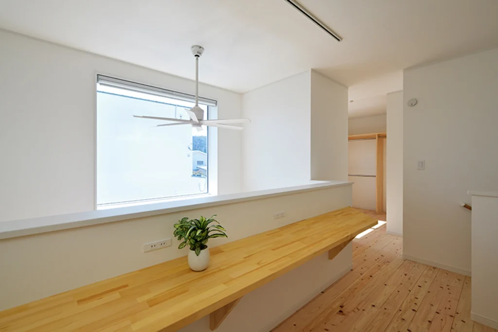 新築の物件は中豊岡町の分譲地の中に完成いたしました。木造2階建て延べ床面積115㎡強でガルバリウム屋根にサイディング貼りの外壁で仕上げられた住宅です。外皮平均熱貫流率Ua値は0.25W/㎡・かなりの高性能住宅です。お客様の熱心な勉強と知識を活かし、吹き抜けの配置や部屋の配置、動線と言った重要な要素を考慮されて設計して戴きました。色の使い方やデザインに拘りを感じさせてくれています。リビングの吹き抜けやキッチンはエネルギー効率の良さを発揮できるプランになっております。2階の有効な活用はとても参考になり改めて大きな意味を持っている住宅の完成と言えます。
