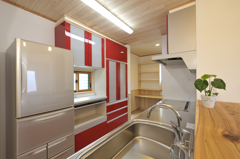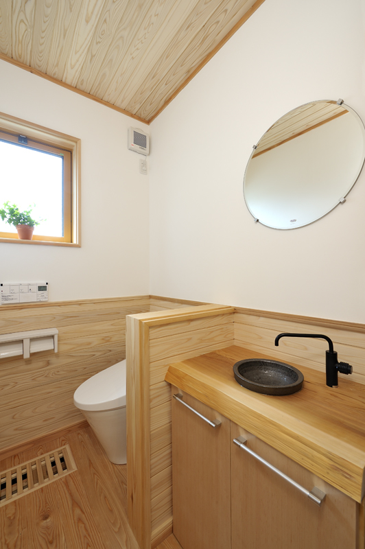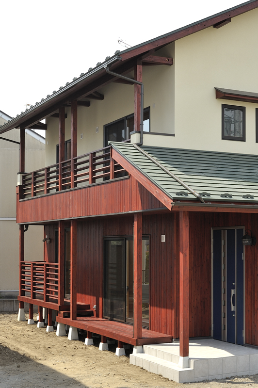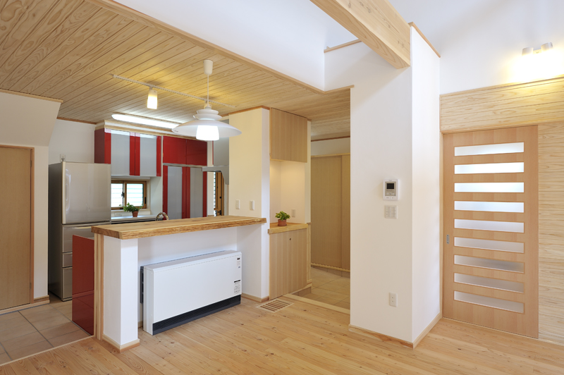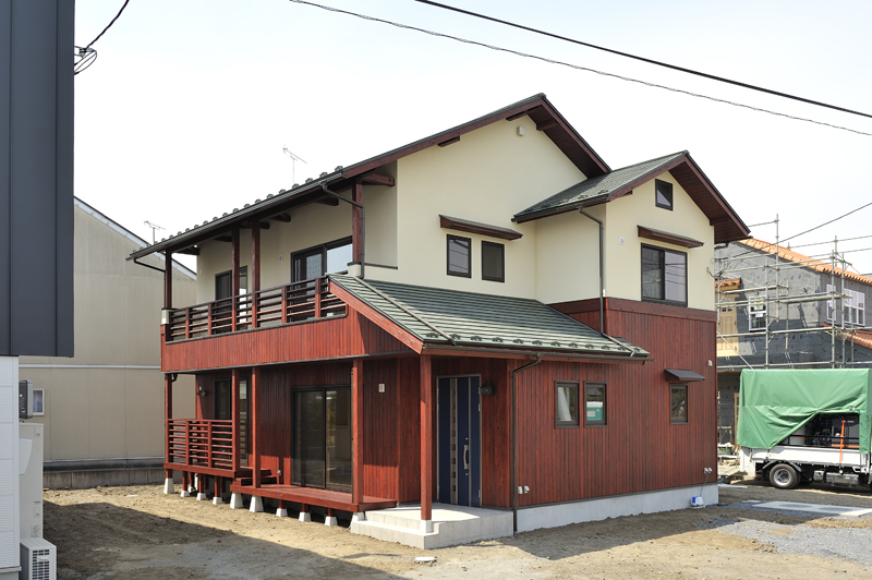 太田市の中心部より富士重工の工場沿いに南下した場所に、住宅が完成しました! 木造2階建て延べ床面積127.52m2、ガルバ二ウム鋼板葺き屋根の住宅です。 外観一階の木材はマホガニーに着色され、2階のモルタル部分とのコントラストは大変美しく仕上がりました。玄関を開けて中に入ると、大きな土間があり、リビングは唐松の床板、漆喰壁、杉板の天井と沢山の自然素材が使用されています。大きな吹き抜けと一段高い和室がリビングでの見所です。2階は子供室と主寝室、大きな納戸、トイレで構成されており、高い天井は大変気持ちの良い物です。エコキュートを使用した暖房が1階の床下埋め込まれ、結果が非常に楽しみです。