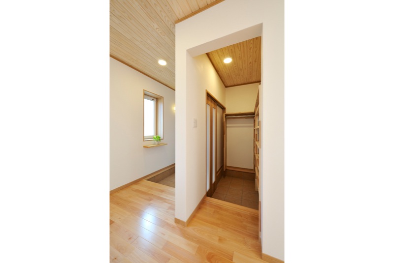 玄関ドアを開けて内部に入ると漆喰と木材の香りが際立、クローク付きの玄関を抜けてリビングには檜の大黒柱が存在感を出しております。天井の杉板 床板の桜と自然素材も沢山使用しております。