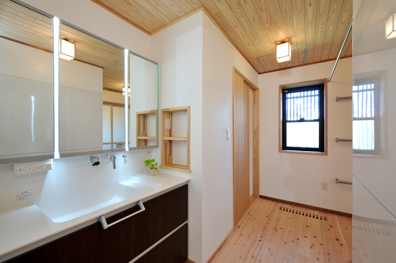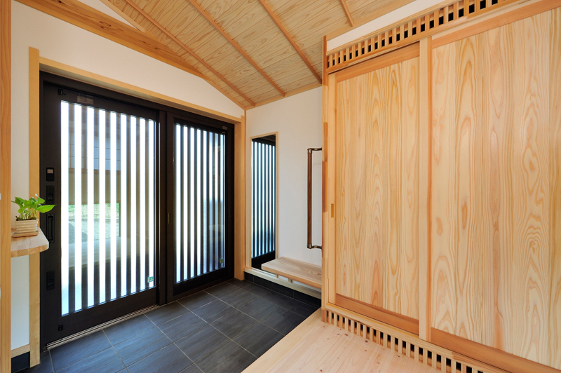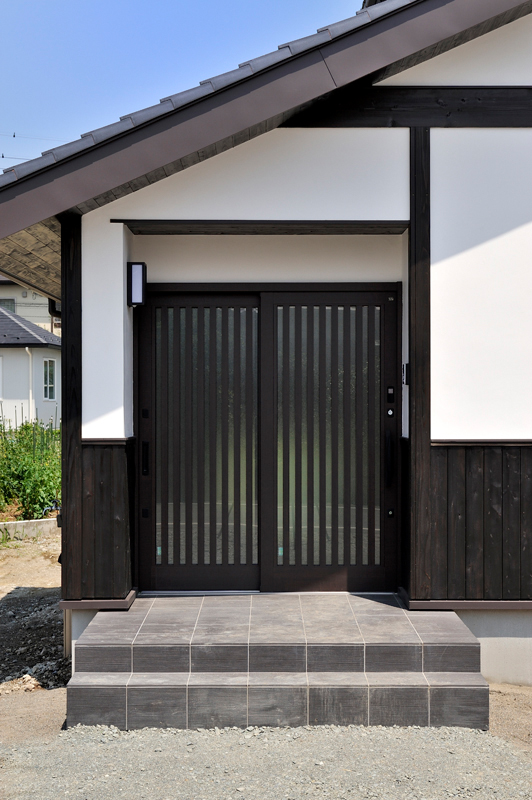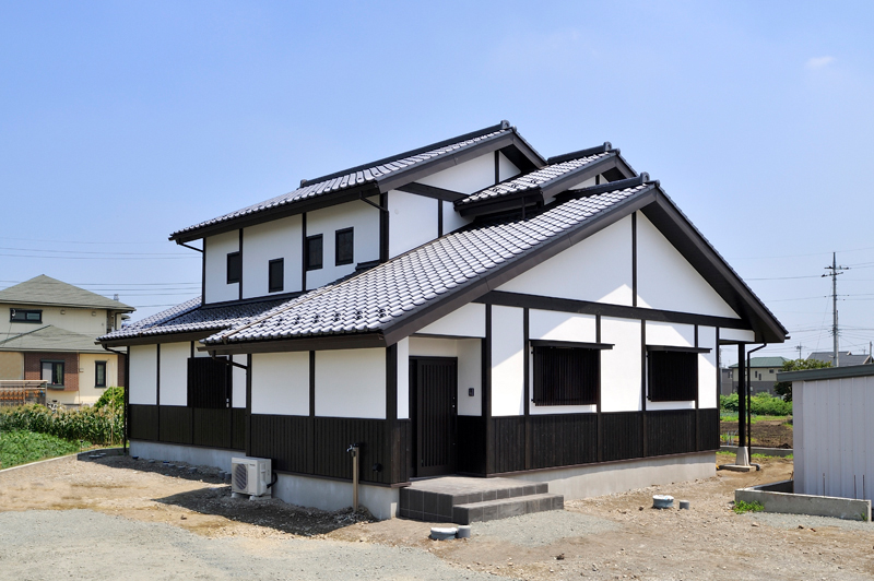 外壁は腰板に付け柱、漆喰壁と銀黒の瓦が落ち着いた雰囲気を出している和風のQ-1住宅が完成致しました。