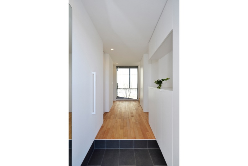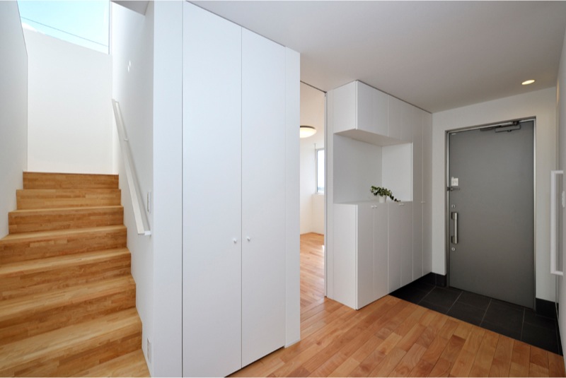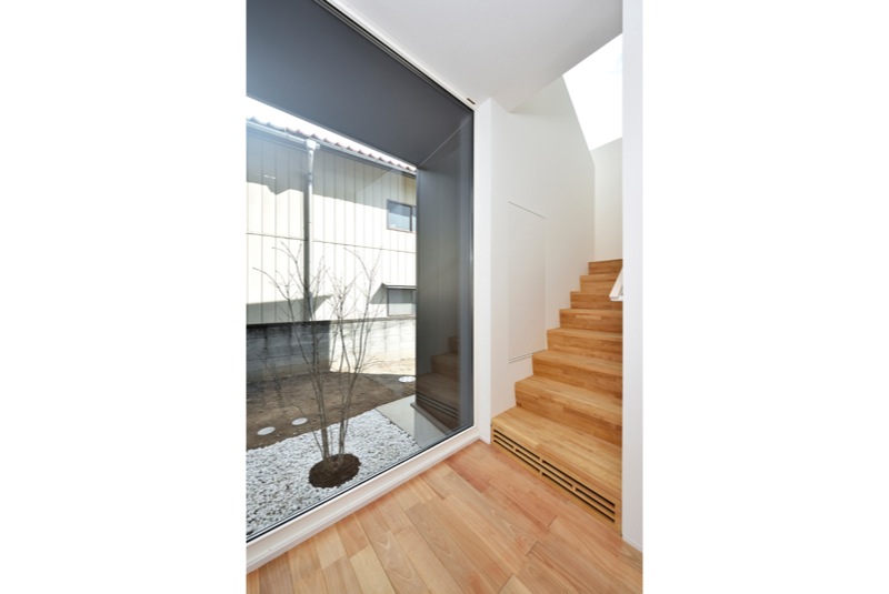 玄関から北側の大きなピクチャーウィンドウに移るアオダモの木、階段上部の大きなFIX 高断熱住宅だからなせる業です。
