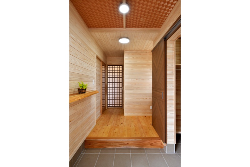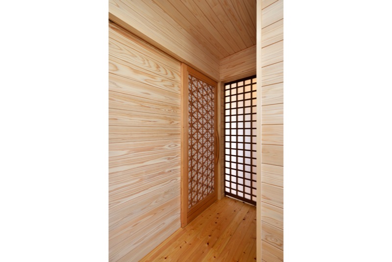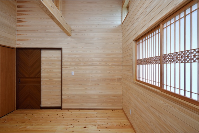 住宅の内部は玄関の天井にアジロが貼って在り、床の檜や 壁の杉板とオシャレな山小屋の中にいる様です。
