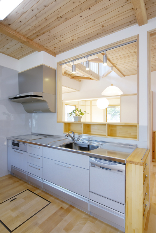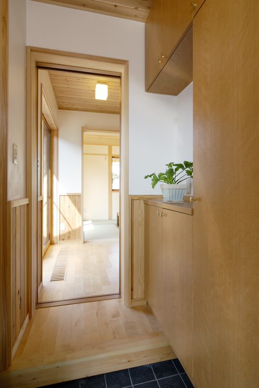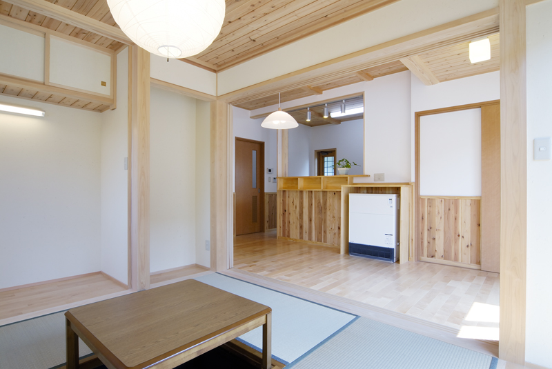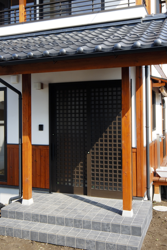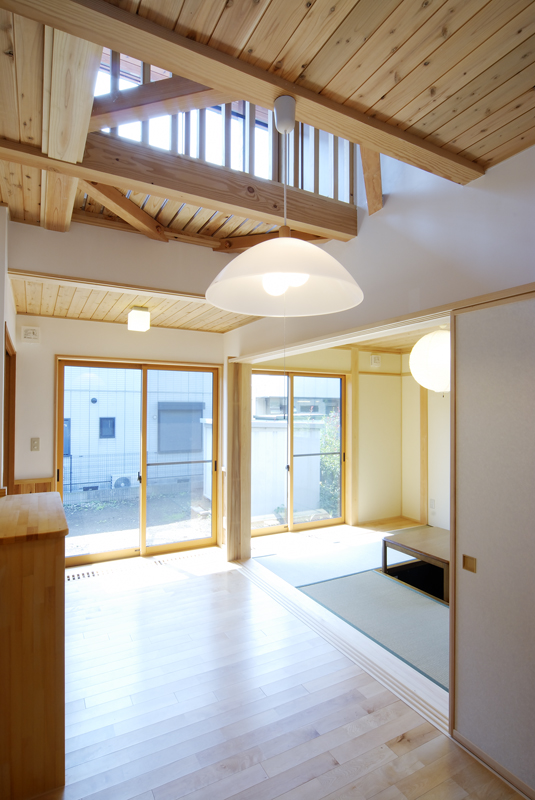 前橋市の総社町に、ご家族3人の和風住宅を建てました。屋根は、和瓦、外壁は漆喰と杉板で仕上げ、軒を深く設計し、夏の日差しを遮るようにし、冬場の日差しをたくさん取り入れるために南には大きな掃き出し窓を設けました。内装は床がカバサクラ、内壁は漆喰と一部県産の杉、天井も県産の杉を貼りました。また、お嬢様のお部屋の壁のみクロスを貼りました。また、限られたスペースの中に吹き抜けを設け、家の中の空気の循環を考慮、温度差の少ない空間を作りあげ、次世代型省エネルギー基準を20%削減できる 住宅を造りました。暖房器具は蓄熱暖房機を使用、給湯器はエコキュートを使い、調理器具は、IHクッキングヒーターを仕様しオール電化住宅となっていま す。
