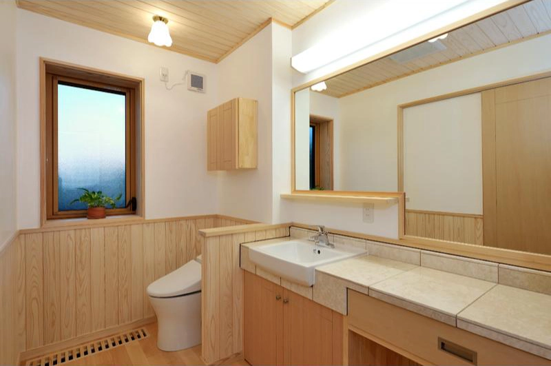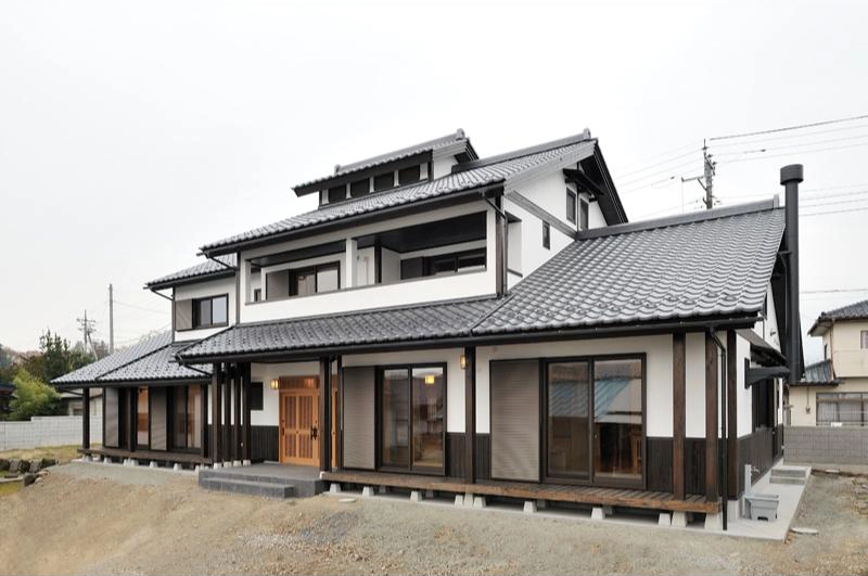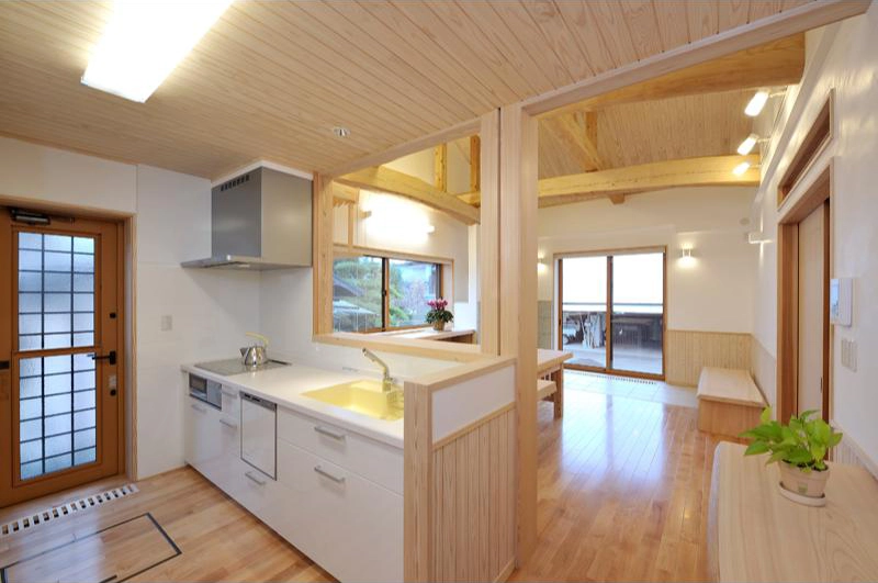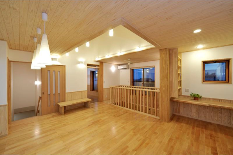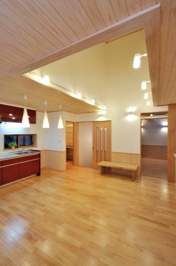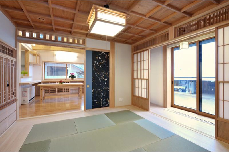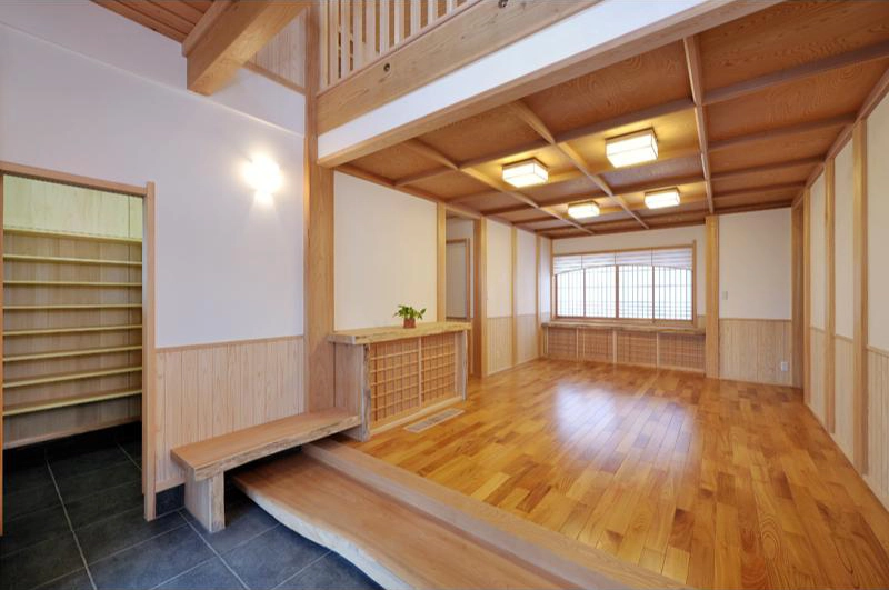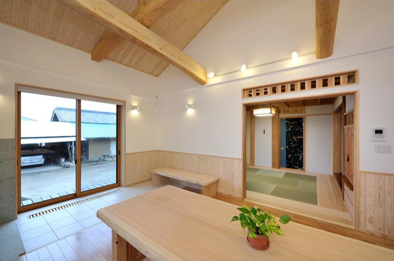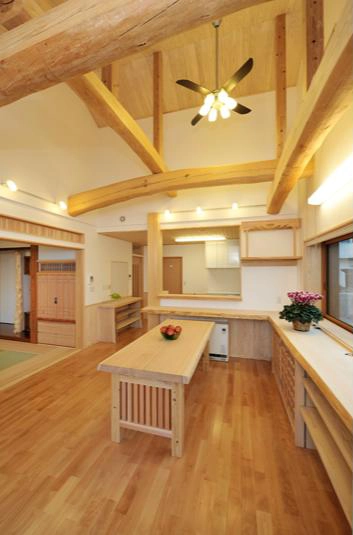 赤城山南面の広い高原に200ミリ和風の住宅は完成いたしました。木造2階建て、72坪の2世帯住宅は、冬暖かく、夏涼しい、高断熱、高気密住宅が持つ性能が最大限に発揮された住宅に仕上がりました。玄関は引き違いの4枚戸のサッシがあり、引き戸を開いて住宅内に入ると、2間ある玄関の広さに驚きを感じ、左右の欅の大黒柱は豊かさの象徴の様です。東側には和室があり、合天は杉の赤みが奇麗に細工され、匠の技の正確さを印象つけます。リビングには梁丸太が複雑に組み込まれており、古き良き日本を思い出します。全体に壁は漆喰で、明るさの代名詞です。200ミリ断熱は早朝でも20℃近い暖かさを担保しそうで、これから始まる生活は、笑い顔の堪えないものになりそうです。
