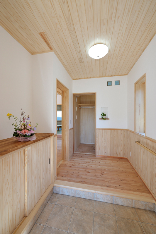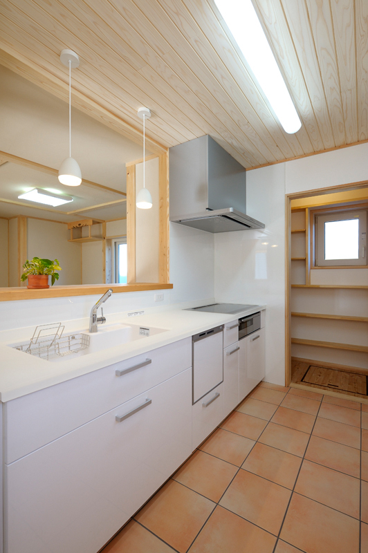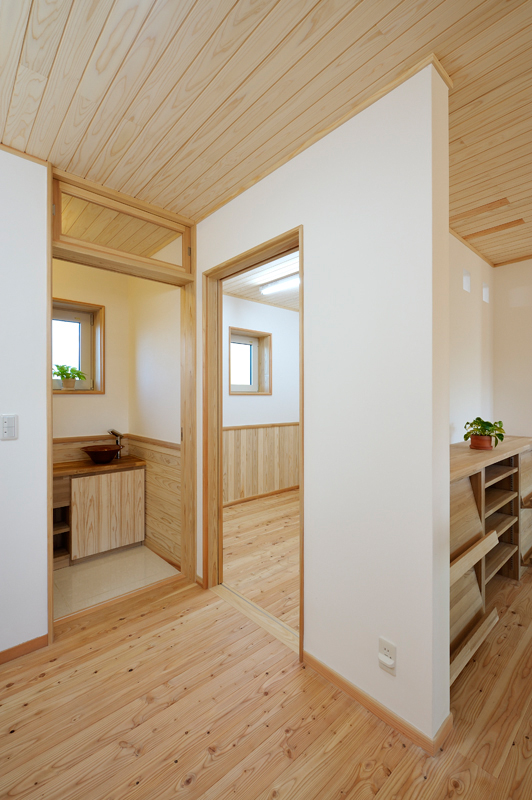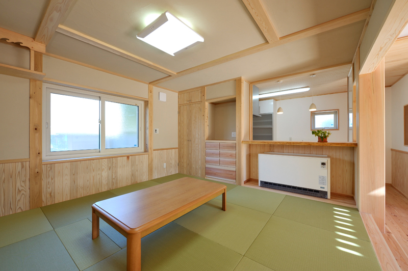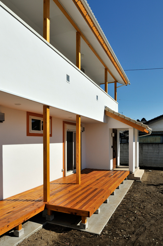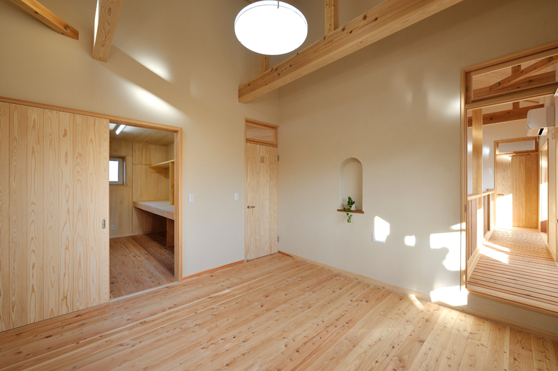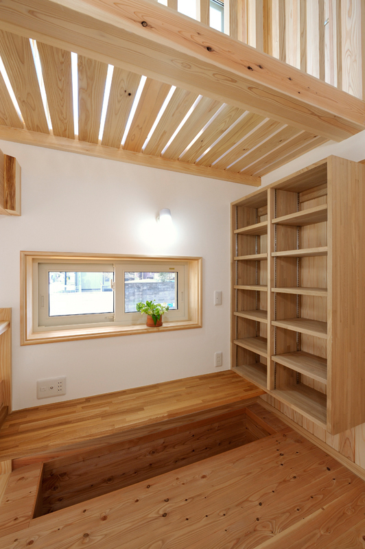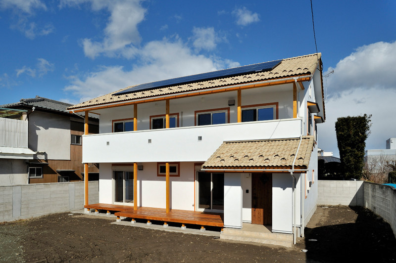 床面積50坪の2階建て住宅は、可愛い瓦が上がり漆喰の外壁で、どこかメルヘンチックに仕上がりました。住宅内部は自然素材が沢山あり、木材は檜や杉など県産材が使用され、壁には漆喰と霧島の火山灰も塗られています。中2階があり、パソコンや趣味の時間が過ごせるようになっています。大きな吹き抜けにはキャットウォークがあり、計算された空気の動きは、夏対策に有効で大きな効果が期待されます。工夫された本箱は、とても使い勝手がよさそうで綺麗に上がりました。200ミリ断熱の住宅は熱損失係数が1.29W/㎡Kで、4KWの太陽光発電で使用するエネルギーのキャンセルができればゼロエネルギーになります。
