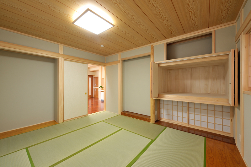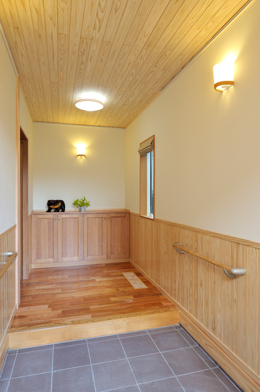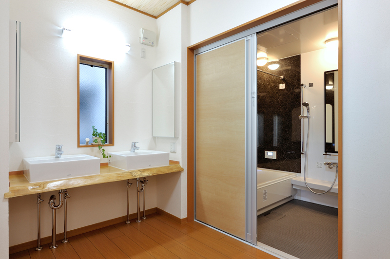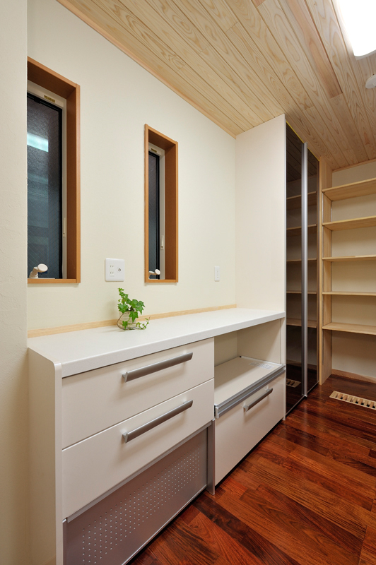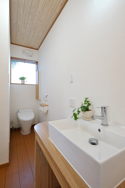 建物の規模は1、2階合わせて43坪強で非常に使いやすい動線の住宅です。漆喰壁や欅の床板など沢山の自然素材使い、高断熱、高気密住宅の特徴を十二分に生かしてより快適により省エネに長い間使用される住宅に仕上がりました。