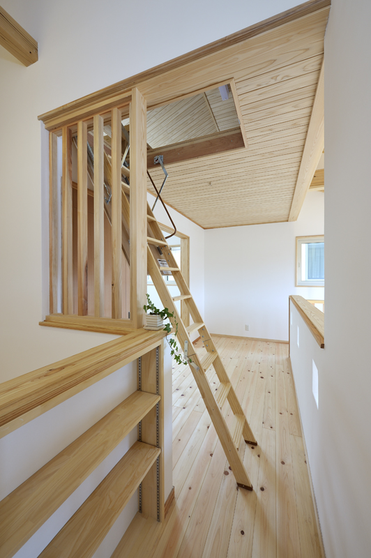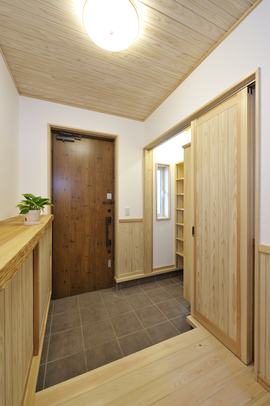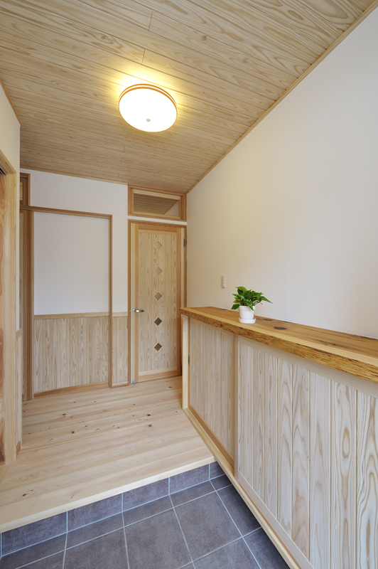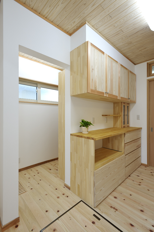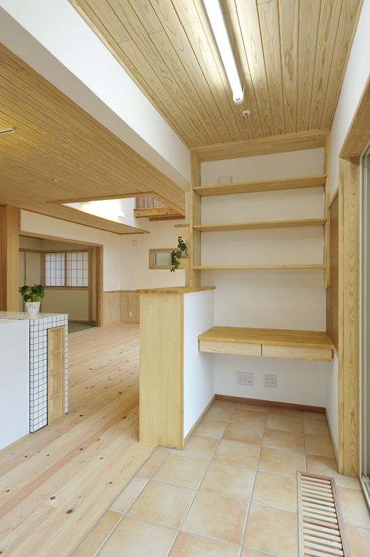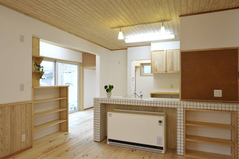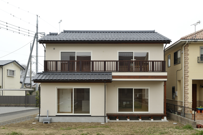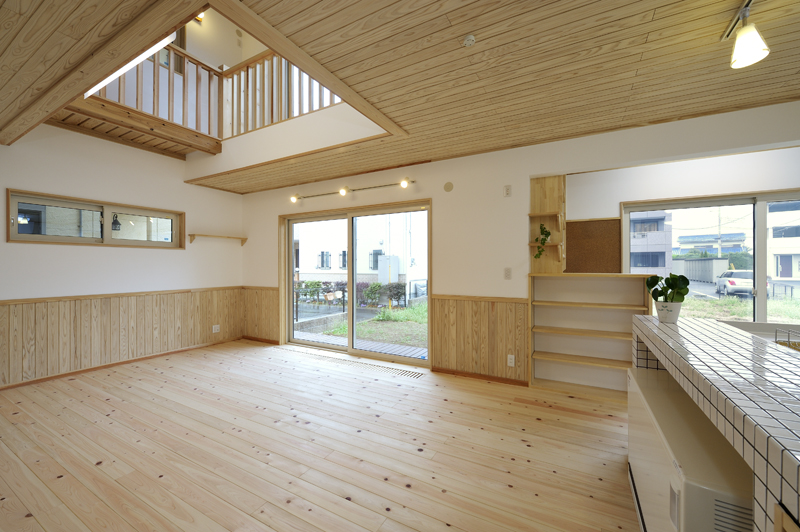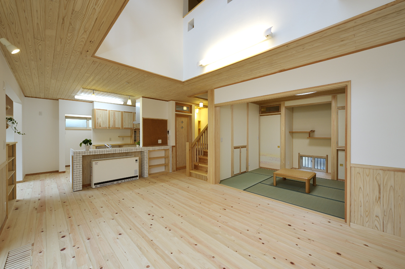 高崎市中居町の高断熱住宅は、木造2階建て、延べ床面積136.21m2の住宅です。瓦屋根にモルタル吹付けの外壁は付近と調和が見事にでき、樹脂サッシが暖かそうです。北入り玄関を住宅内に入ると、玄関わきのクロークが家族の靴を整然としてくれ、広縁を通りリビングに入ると、大きな吹き抜けに目を取られます。高断熱住宅ならではの大空間は、癒しと心地よさを与えてくれています。アイランド型のキッチンは白で清潔感たっぷりです。キッチン南の温室は、タイル張りの床が温度調節をしてくれそうです。南面の大きな窓は太陽の光を沢山通して冬の補助暖房をしてくれそうです。檜の床 杉の天井、漆喰壁、珪藻土壁の和室とやはり住み心地は大変良さそうです。