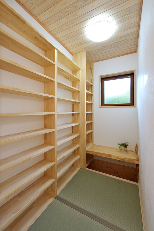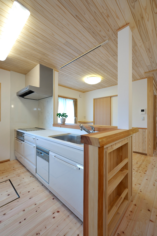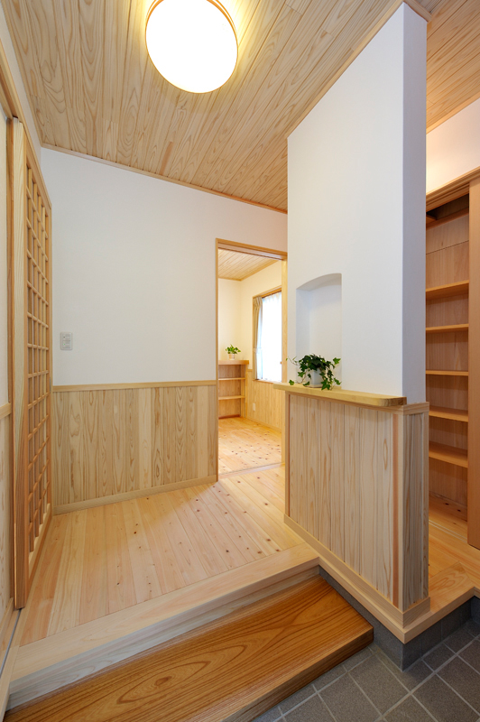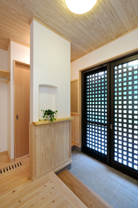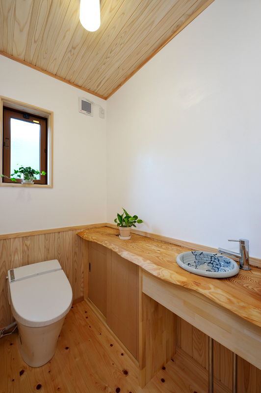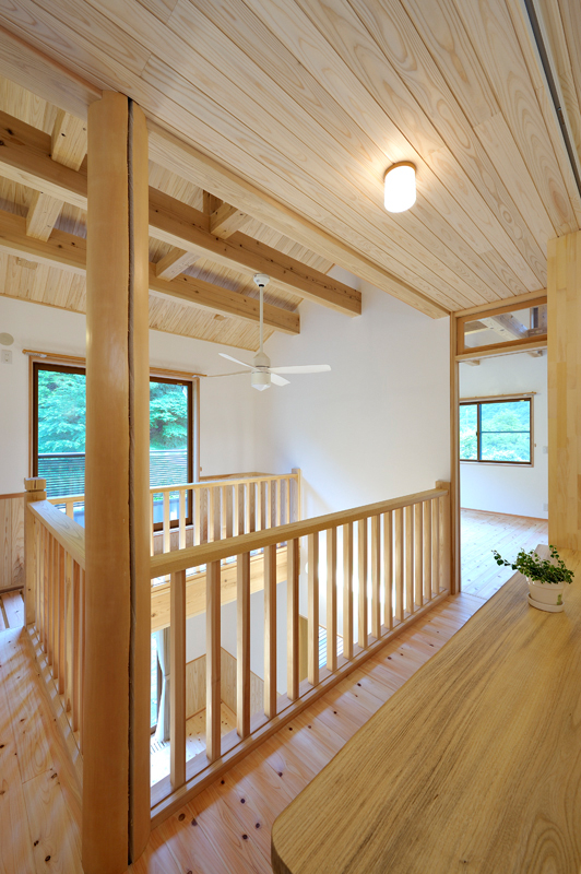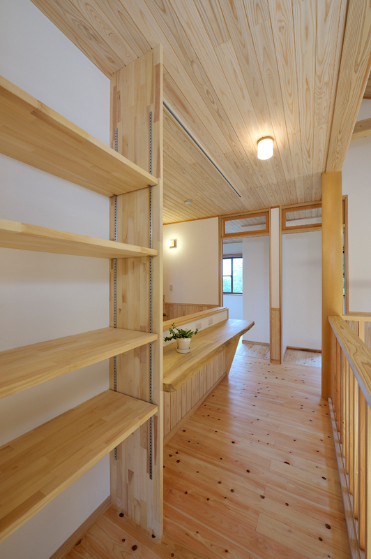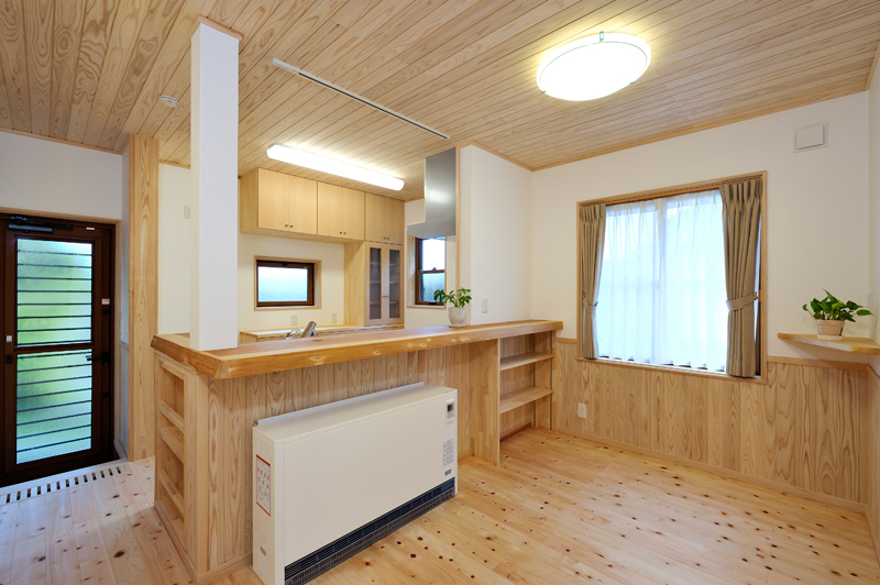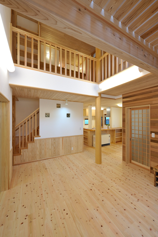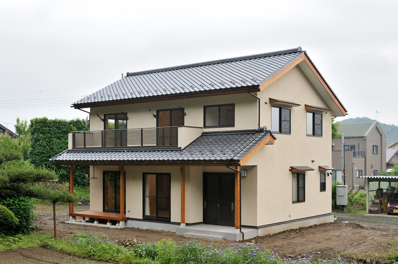 富岡の南西にあるサファリパーク、入口から車で2~3分走ると、完成した長期優良住宅があります。木造2階建て、延べ床面積130.01m2で、屋根には、和型の瓦、壁はモルタル吹き付け塗装で仕上がりました。玄関を入ると、漆喰や木材が沢山使用され居心地の良さを感じるとともに、心地よい香りが漂います。ケヤキの式台は重みを感じさせてくれています。玄関からリビングに入ると大きな丸太に目を引かれます。杉の一枚板でつくられたテレビ台など、匠の技術が十分に発揮されニッチや花瓶台など細かなところにも十分気遣いされた仕事には爽やかを感じる事ができます。檜の床板、杉の天井板、漆喰壁中ではホットする事ができそうです。2階は子供室、寝室とつくられましたが、屋断熱で確保された空間には梁や天井板など見えかがり部分の取り合いが見事に組み上げられました。