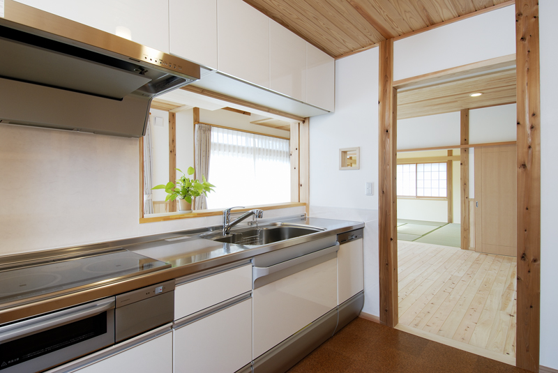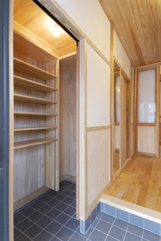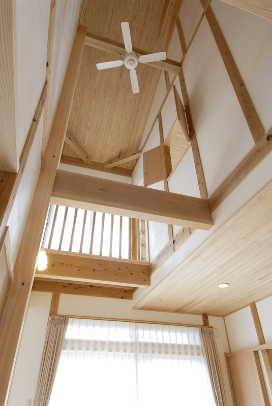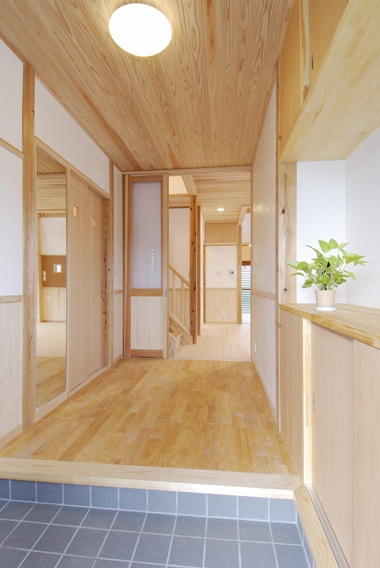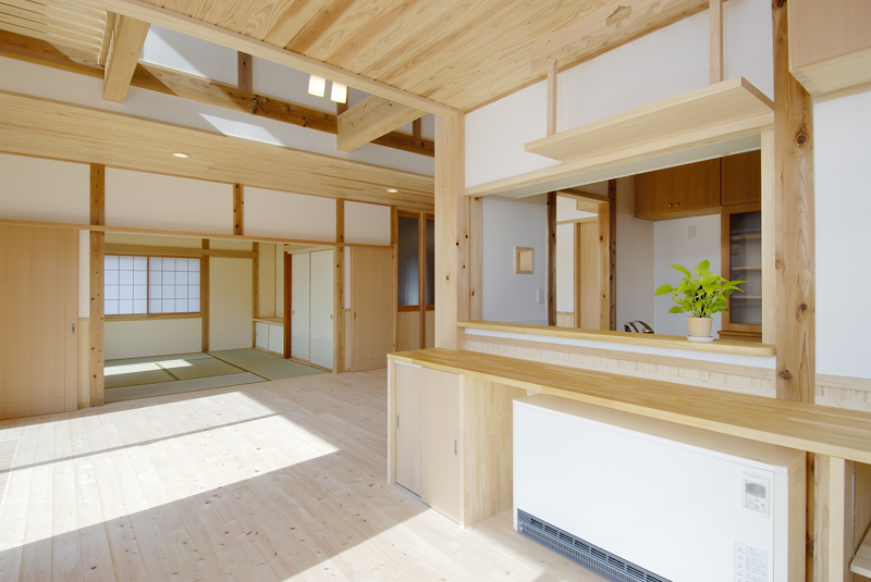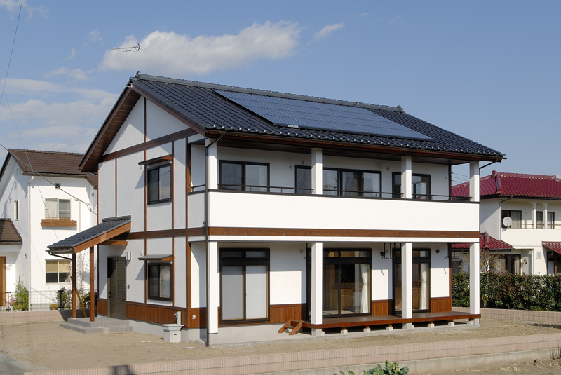 前橋の南に和風の住宅が完成いたしました。和型の瓦に漆喰壁、杉の腰板、昔を思い出す住宅です。屋根には太陽光の発電システムがのり、何処となく現代風の予感が致します。玄関は木の香りと暖かさで驚きを感じます。リビングには、8寸の檜の大黒柱と綺麗に加工された杉の桁 柱が漆喰壁に囲われ優しさを醸し出しております。生き節の檜の床板は心地よい香りを漂わせて癒 し訪れる人に気持ちの安らぎを与えてくれそうです。2階は子供室と主寝室 工夫されたクロークが大きな収納力を、吹き抜けのキャットウォークは、子供室と 寝室のかけ橋で、遊びあう子供たちの笑い声が聞こえそうです。日当たりの良い冬、南の大きなサッシュは、暖かい太陽の光を十分に取りいれて、ポカポカ暖か く昼寝でもできそうです。今では珍しい欄間、夏の通風用で住宅内の出入り口の上部にある回転欄間とともに威力を発揮してくれるでしょう。NEDO、県産材の構造材、太陽光発電と多彩な補助金は、有難いものです。