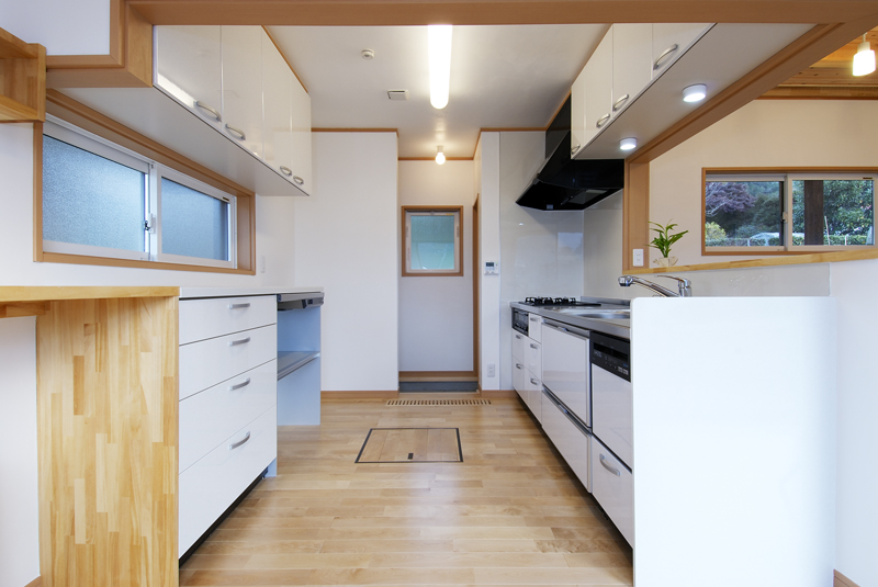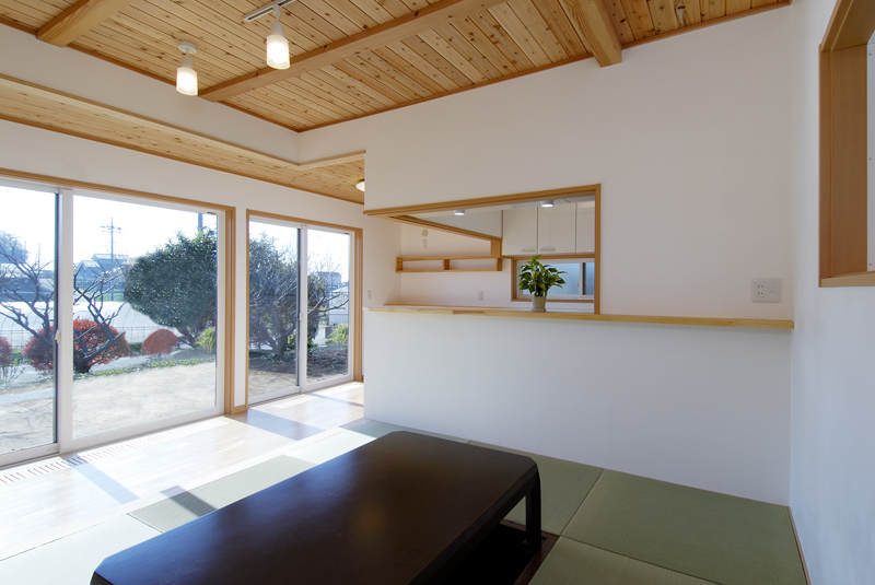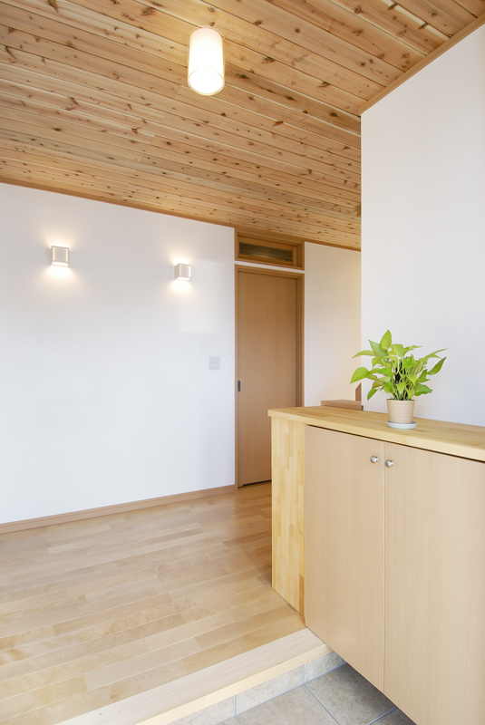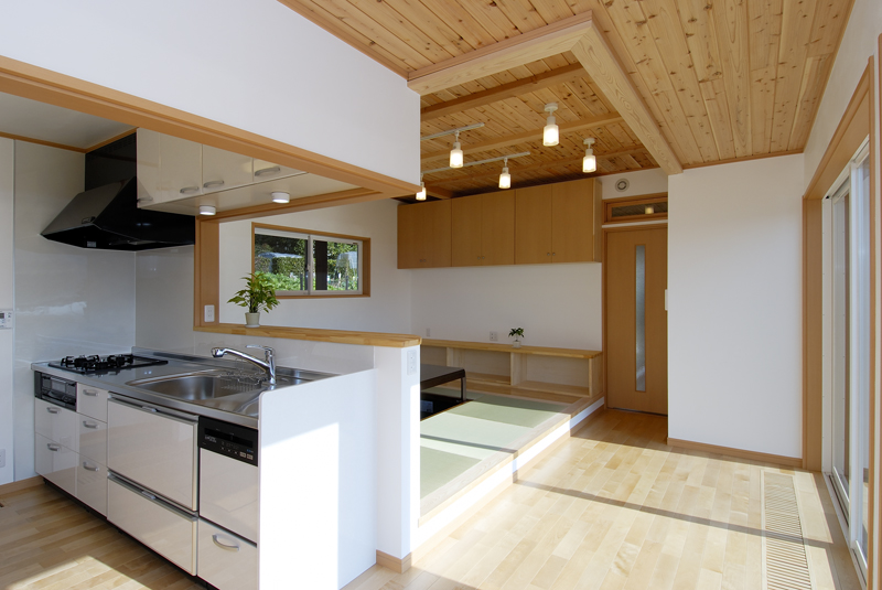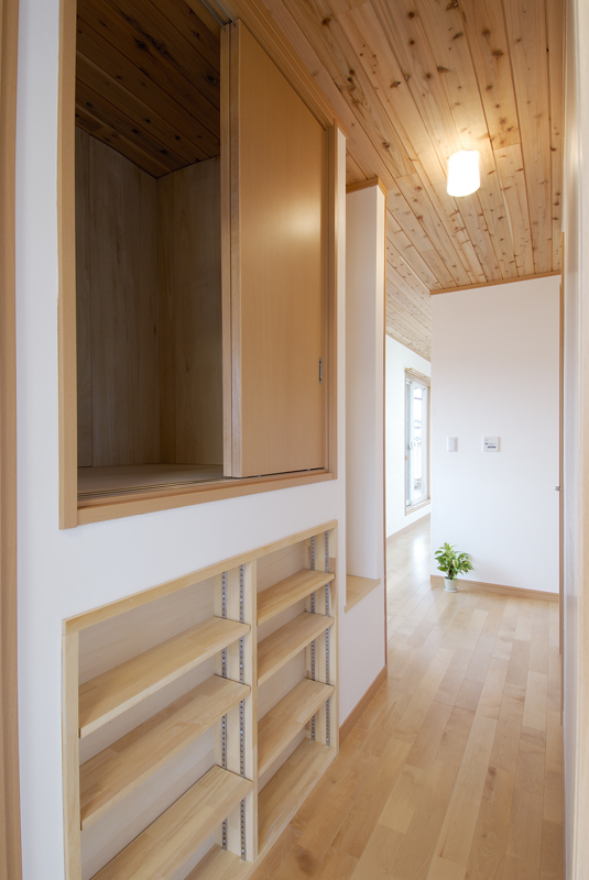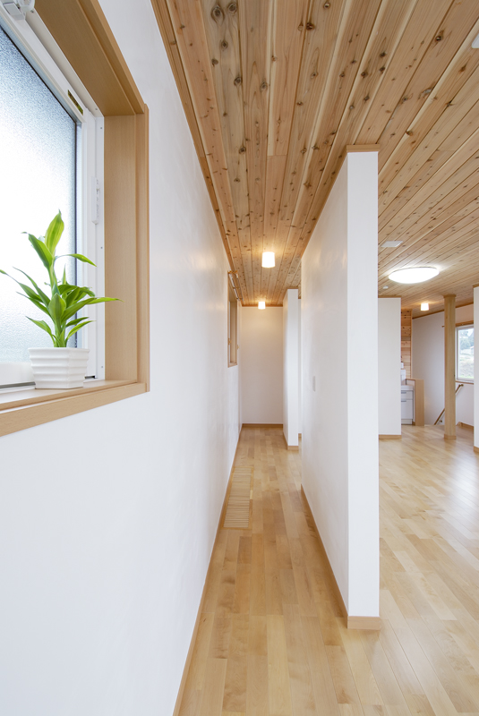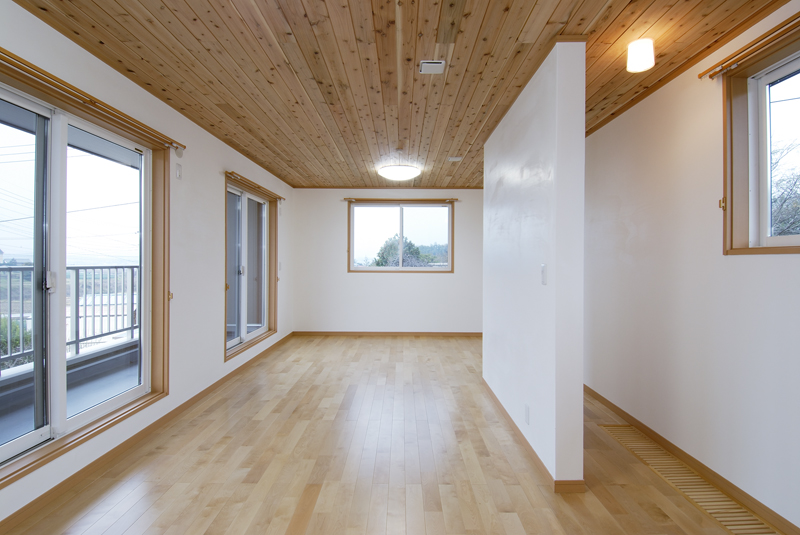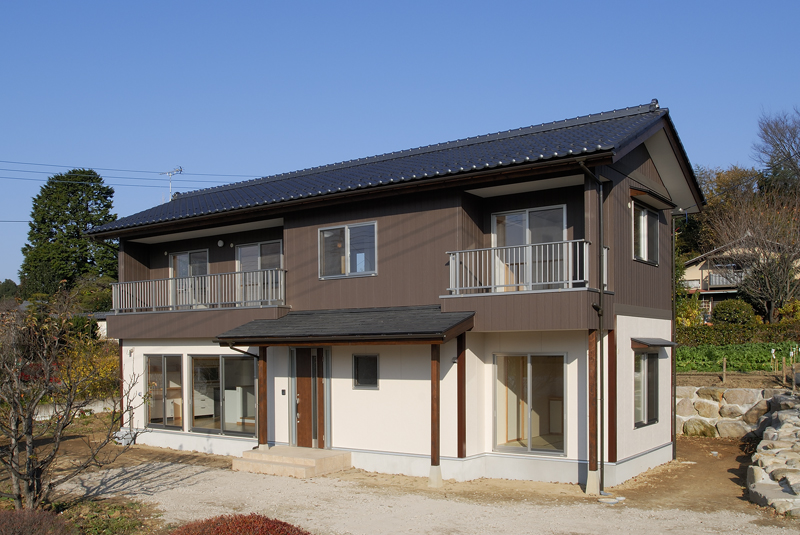 前橋から渋川にむかい、板東橋の手前をまっすぐ100mほど上ると、ま新しい蕎麦屋さんがあります。手前を左にまがり500mほどの日当たりの良い場所 に和型瓦で外壁が2色に塗り分けられた住宅が完成いたしました。中に入ると漆喰の白さと木材の香りが、癒しの心持ちを与えてくれます。東西に長いこの住宅 は全ての居室が南に面し、大きなサッシは太陽の恵みを十分に戴いて大変暖かく、自然と家族の笑い声が聞こえてきそうです。高断熱住宅は,1台の暖房器具で 暖を取る傾向にありますが、吹き抜けの無いこの住宅は和室の天井が二階まで抜けており、吹き抜けを補う上手な工夫が施されました。柱は檜で、杉の天井板、 漆喰、珪藻土壁 樺の床板と自然素材を沢山使用しており、住宅内は森の中にいるような気持になります。補助金はNEDOと県産材とを頂きました。前橋と渋 川の夜景はとても綺麗に見えるのは、とても印象深かったです。